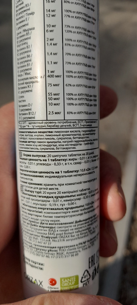Беру не в первый раз разные витамины Orzax, но впервые сталкиваюсь с такой наклейкой, обычно срок годности на БАДах выбит или выгравирован, здесь любой срок можно напечатать при желании. Состав натуральный. На вкус еще не пробовала