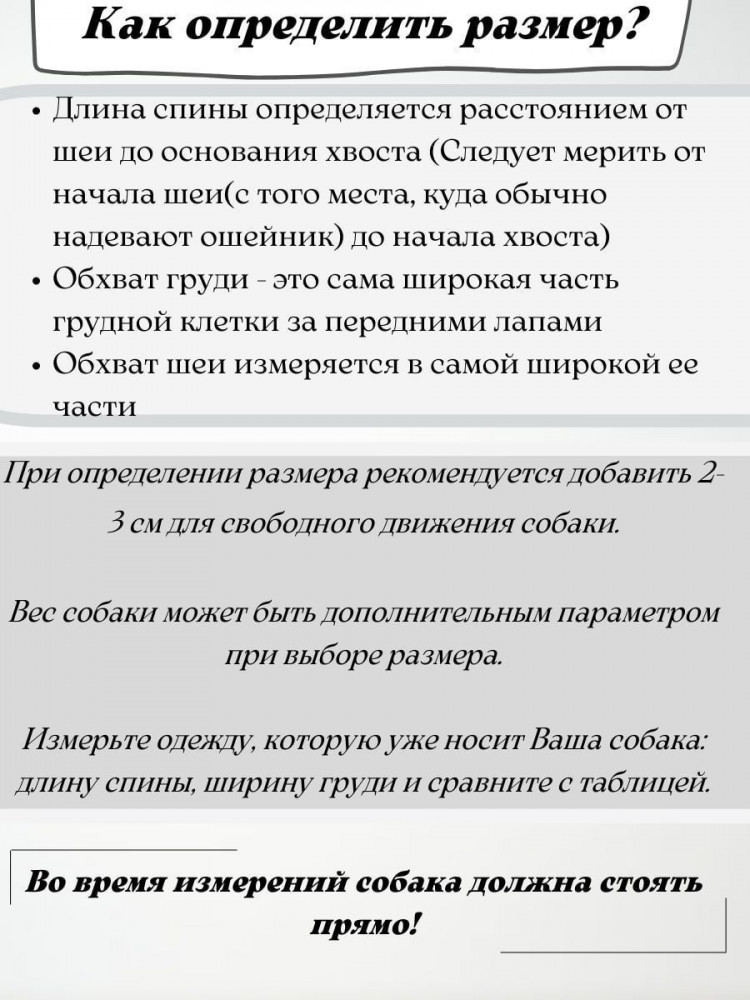 У комбинезона мягкая, тёплая плюшевая подкладка и прямые манжеты на лапах. Есть возможность регулировать объём комбинезона с помощью шнурка в области талии и кулиска. Для удобства рекомендуется одевать сначала передние лапки, застегивая первую кнопку на шее, таким образом ваш питомец никуда не денется; далее уже одевать задние лапки и полностью застегивать комбинезон и регулировать по объему. Если мерки вашей собачки попадают между размерами, лучше взять размер побольше, в этом случае внутрь можно одеть свитер, а собаке будет комфортно двигаться. Можно подворачивать манжеты. Модель неприхотлива в уходе.