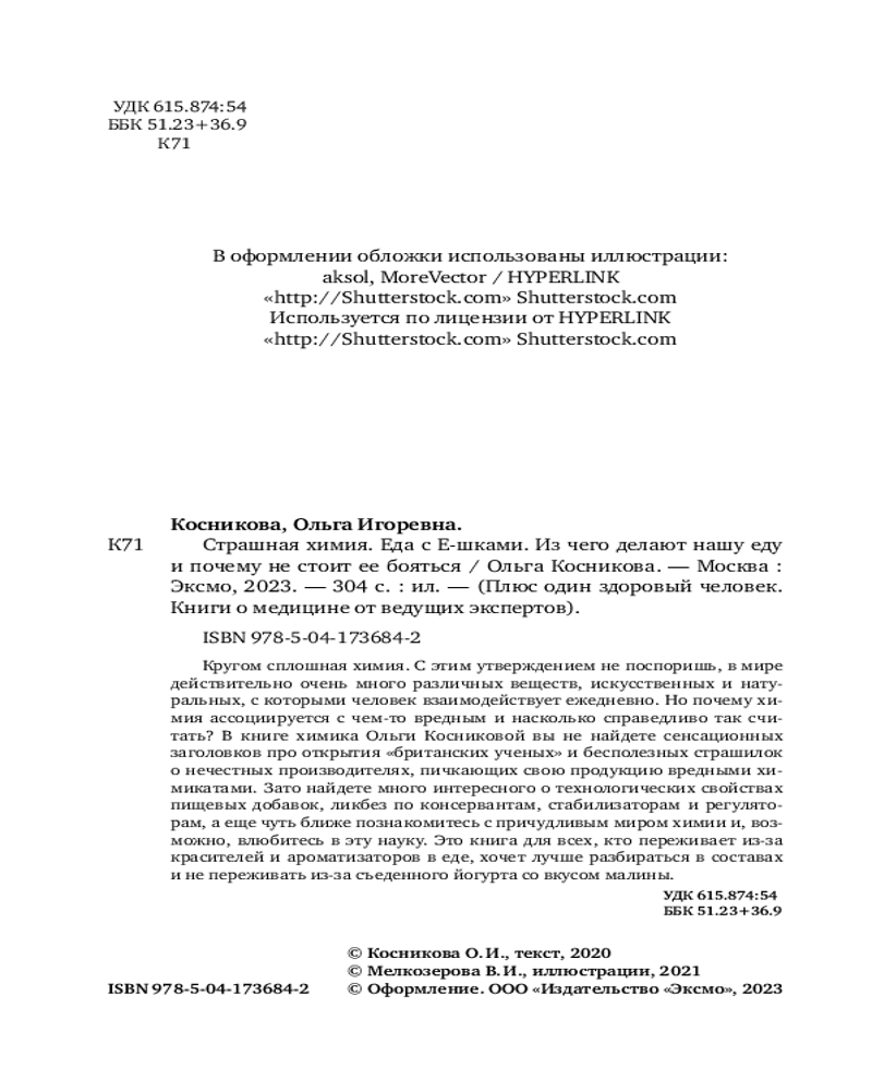 💳 Оплатить за товар можно при получении 🇰🇿 Есть бесплатная доставка по Казахстану от 1 дня 🎁 Копите бонусы с каждой покупки Серия: Плюс один здоровый человек. Книги о медицине от ведущих экспертов Что скрывает от вас ваша любимая шоколадка и о чем молчит йогурт со вкусом персика? Вокруг пищевых добавок сложился зловещий ореол, в то время как об их реальных свойствах мало кто знает. Безликий индекс из букв и цифр ни о чем не говорит обычному покупателю, а ГМО, Е-шки, глутамат и прочие добавки ассоциируются с чем-то небезопасным и ненатуральным, «химическим». Но, может, не так страшна химия, как ее малюют? |