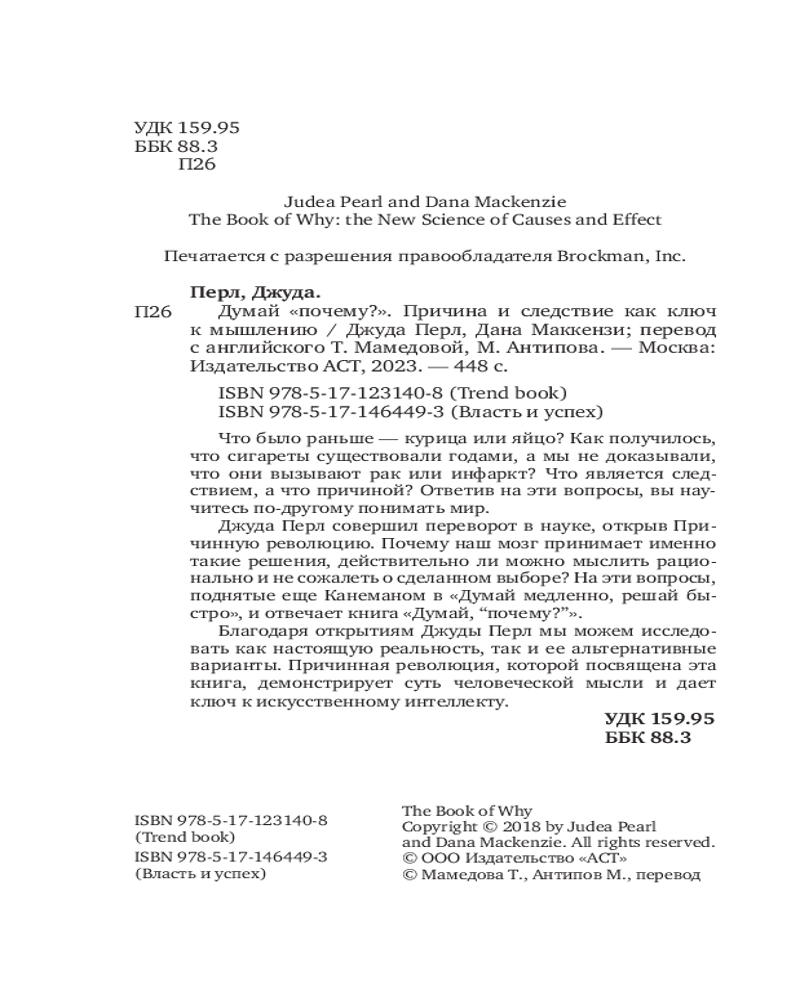💳 Оплатить за товар можно при получении 🇰🇿 Есть бесплатная доставка по Казахстану от 1 дня 🎁 Копите бонусы с каждой покупки Серия: Trend book Удостоенный премии Алана Тьюринга 2011 года по информатике, ученый и статистик показывает, как понимание причинно-следственных связей произвело революцию в науке и совершило прорыв в работе над искусственным интеллектом. «Корреляция не является причинно-следственной связью» — эта мантра, скандируемая учеными более века, привела к условному запрету на разговоры о причинно-следственных связях. Сегодня это табу отменено. Причинная революция, открытая Джудией Перлом и его коллегами, пережила столетие путаницы и поставила каузальность — изучение причин и следствий — на твердую научную основу. |