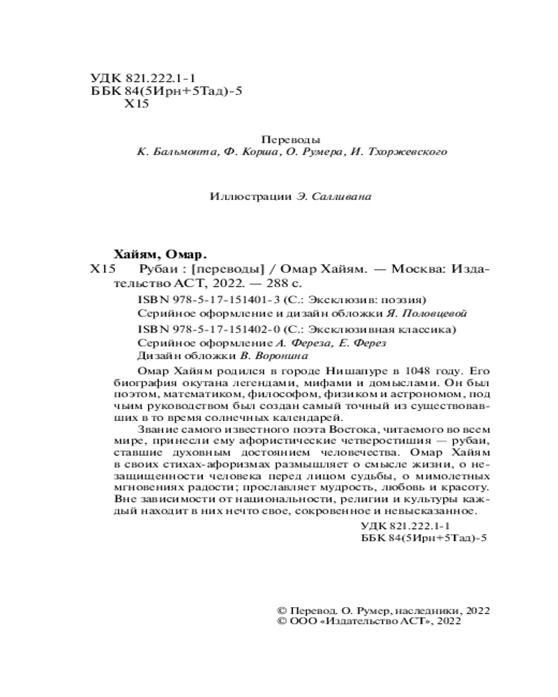 💳 Оплатить за товар можно при получении 🇰🇿 Есть бесплатная доставка по Казахстану от 1 дня 🎁 Копите бонусы с каждой покупки Серия: Эксклюзивная классика Омар Хайям родился в городе Нишапуре в 1048 году. Его биография окутана легендами, мифами и домыслами. Он был поэтом, математиком, философом, физиком и астрономом, под чьим руководством был создан самый точный из существовавших в то время солнечных календарей. Звание самого известного поэта Востока, читаемого во всем мире, принесли ему афористические четверостишия — рубаи, ставшие духовным достоянием человечества. Омар Хайям в своих стихах-афоризмах размышляет о смысле жизни, о незащищенности человека перед лицом судьбы, о мимолетных мгновениях радости; прославляет мудрость, любовь и красоту. Вне зависимости от национальности, религии и культуры каждый находит в них нечто свое, сокровенное и невысказанное. |