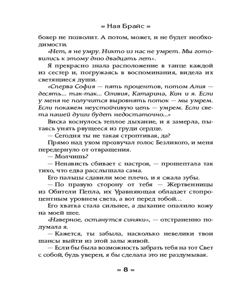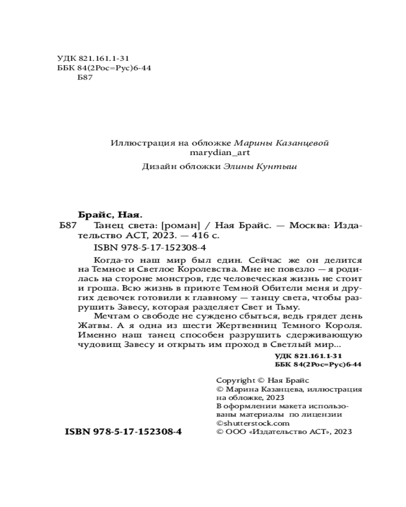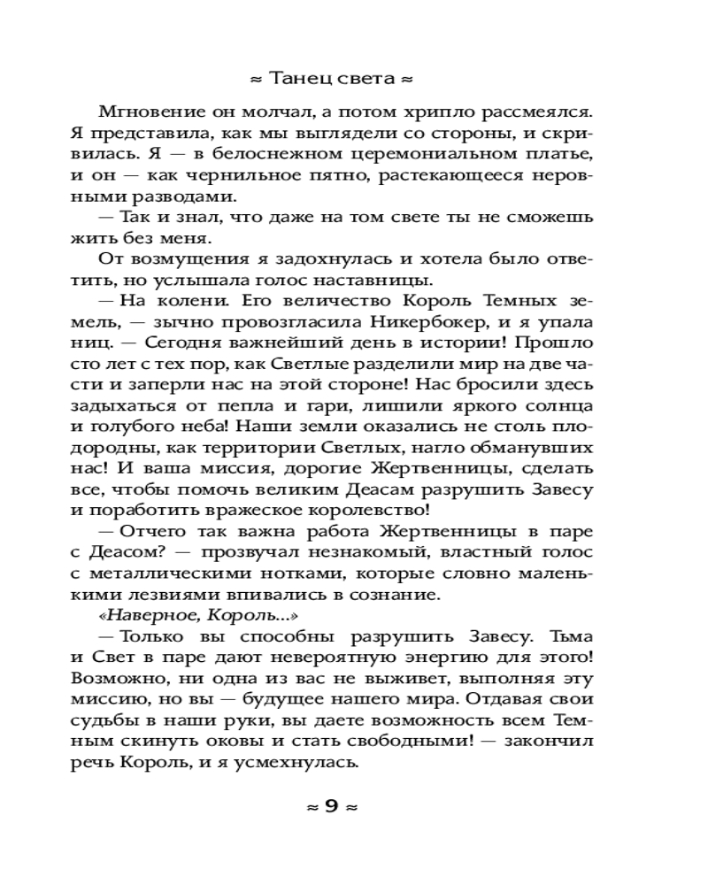 💳 Оплатить за товар можно при получении 🇰🇿 Есть бесплатная доставка по Казахстану от 1 дня 🎁 Копите бонусы с каждой покупки Серия: Wattpad. ТОП на русском Когда-то наш мир был един. Сейчас же он делится на Tемное и Светлое Королевства. Мне не повезло — я родилась на стороне монстров, где человеческая жизнь не стоит и гроша. Всю жизнь в приюте Tемной Обители меня и других девочек готовили к главному — танцу света, чтобы разрушить Завесу, которая разделяет Свет и Tьму. Мечтам о свободе не суждено сбыться, ведь грядет день Жатвы. А я одна из шести Жертвенниц Tемного Короля. Именно наш танец способен разрушить сдерживающую чудовищ Завесу и открыть им проход в Светлый мир... |