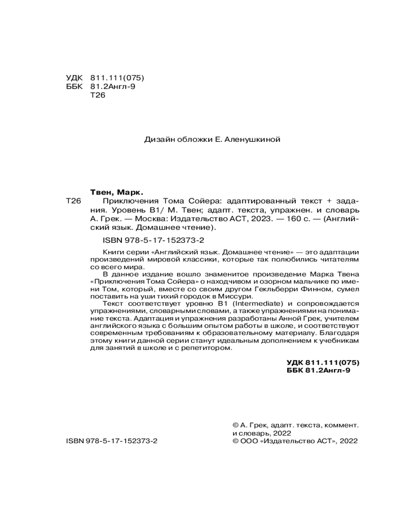💳 Оплатить за товар можно при получении 🇰🇿 Есть бесплатная доставка по Казахстану от 1 дня 🎁 Копите бонусы с каждой покупки Серия: Английский язык. Домашнее чтение Книги серии «Английский язык. Домашнее чтение» — это адаптации произведений мировой классики, которые так полюбились читателям со всего мира. В данное издание вошло знаменитое произведение Марка Твена «Приключения Тома Сойера», о находчивом и озорном мальчике по имени Том, который, вместе со своим другом Гекльберри Финном, сумел поставить на уши тихий городок в Миссури. |
