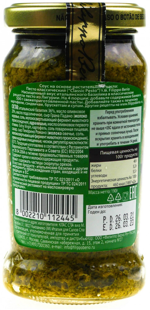 Filippo berio Соус с базиликом и рикоттой «Classic pesto»вкус универсальность для пасты для салатов
