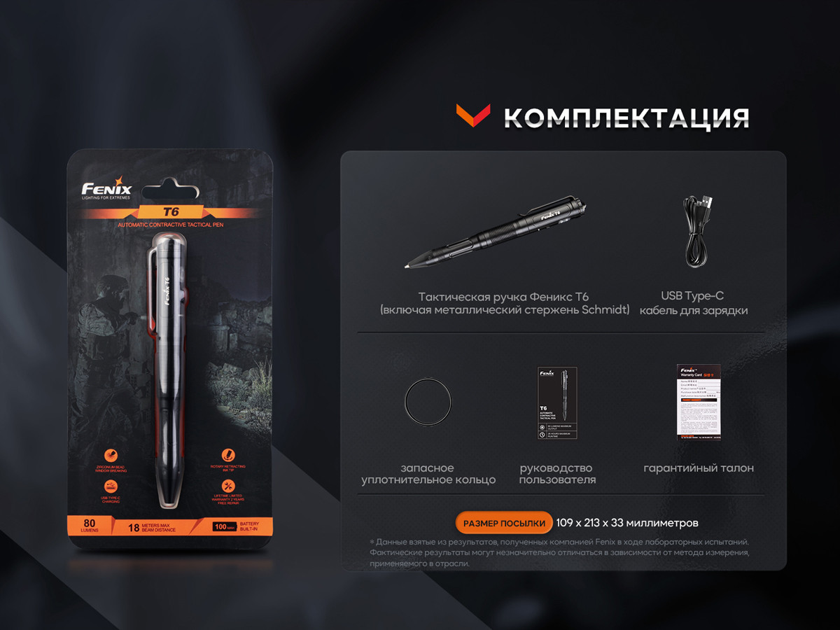 💳 Оплатить за товар можно при получении 🇰🇿 Есть бесплатная доставка по Казахстану от 1 дня 🎁 Копите бонусы с каждой покупки Тактическая ручка Fenix T6 является автоматическим приспособлением для самообороны, способна подсвечивать, разбивать окна и писать. Максимальная яркость освещения достигает 80 люменов, а дальнобойность луча — 18 метров. Фонарь поддерживает зарядку Type-C. |