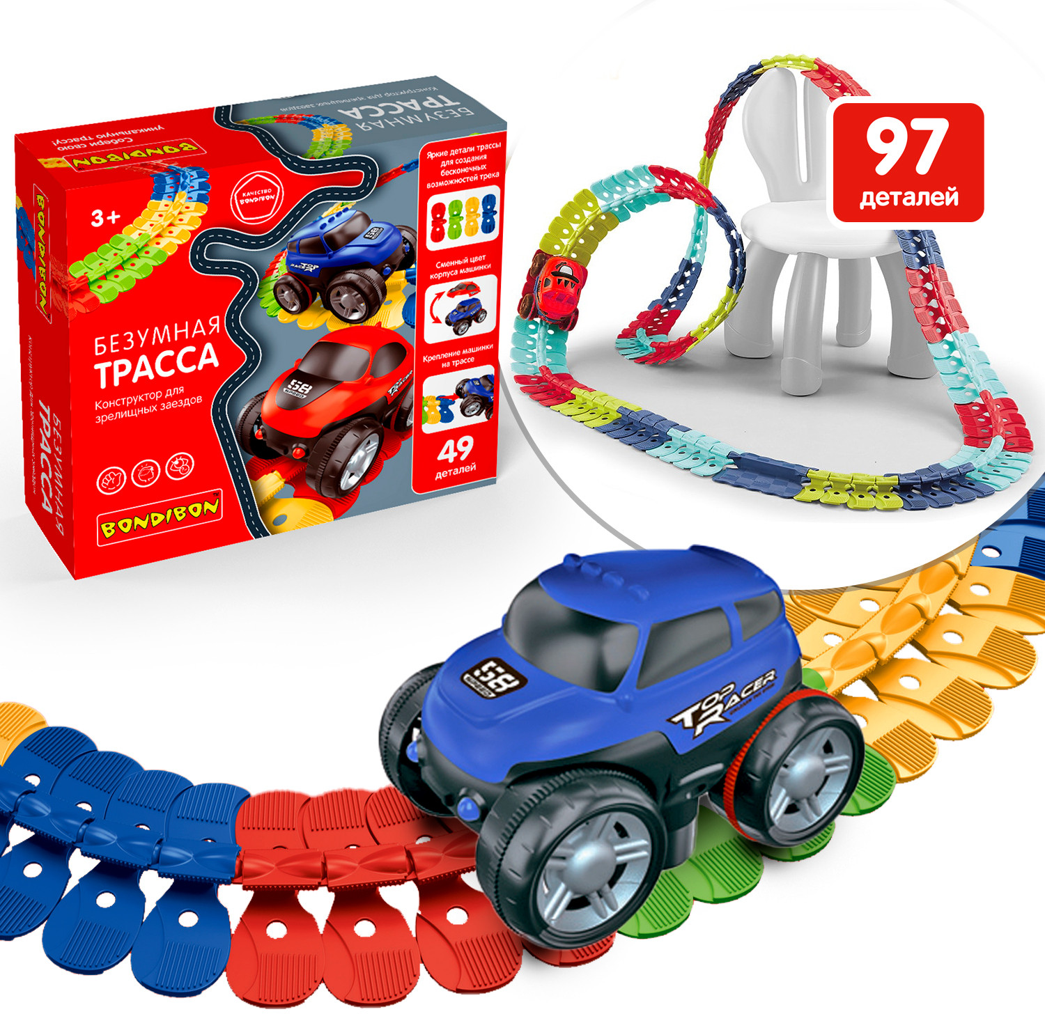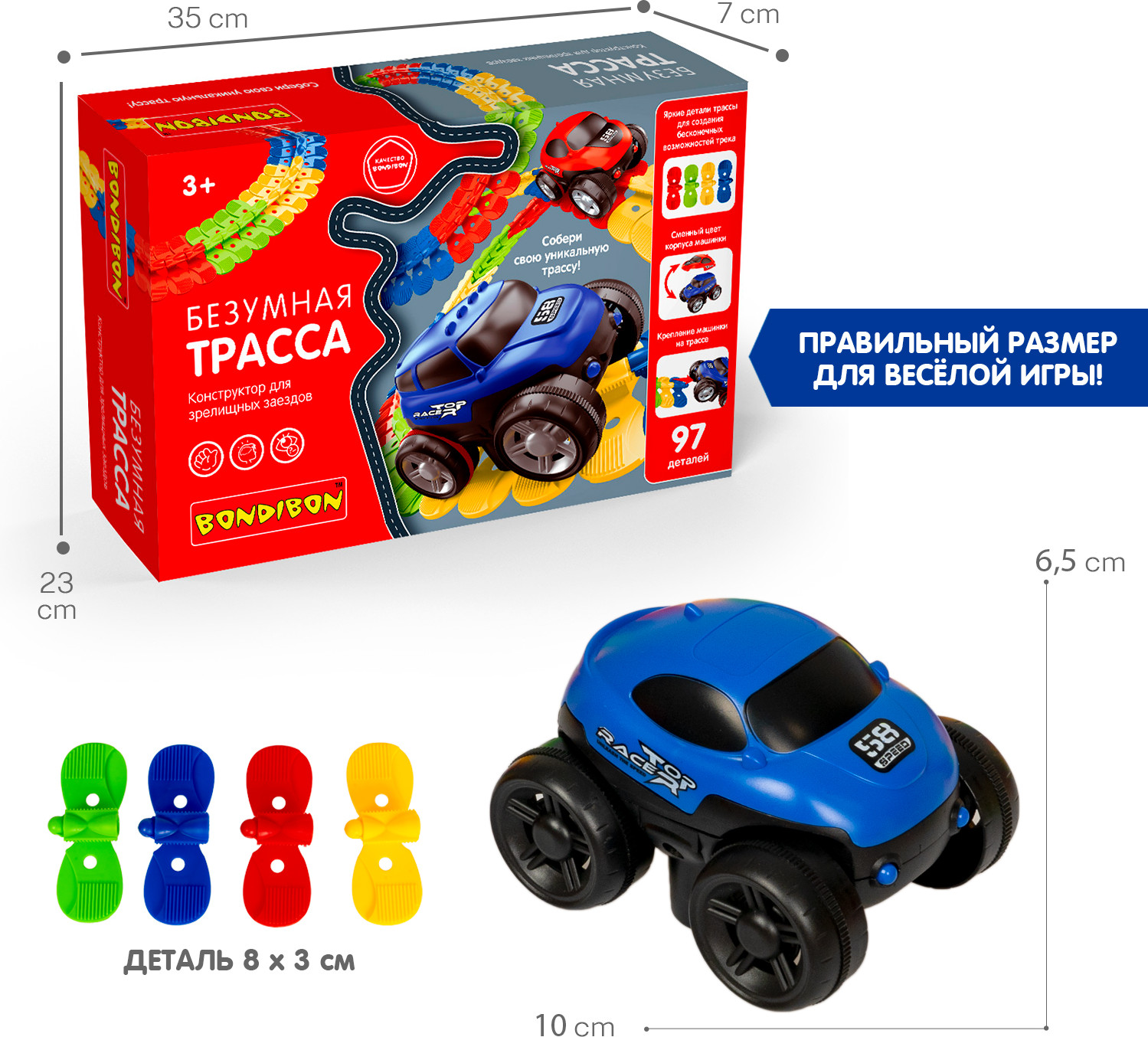Серия: Гибкий автотрек Собери свою уникальную трассу! Популярный тренд от Bondibon — гибкий автотрек «Безумная трасса». Крутые виражи, горки, мёртвые петли! Даже если трассу вместе с машинкой перевернуть, автомобиль не падает и мчится вперед. Трек гнется в любом направлении и принимает любую форму — от крутой петли до горки. Ребёнок может трансформировать трассу без особых усилий, потому что дорога выполнена из мягкой пластмассы. Гибкий трек можно перекинуть через любые препятствия (стул или спинку кровати) — автомобиль проедет везде. |