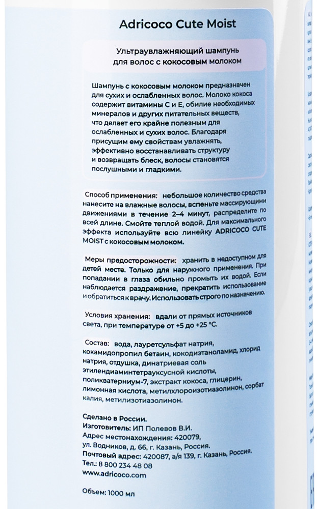 Adricoco Шампунь для волос ультраувлажняющий с кокосовым молоком