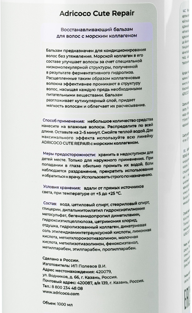 Adricoco Бальзам для волос восстанавливающий с морским коллагеном