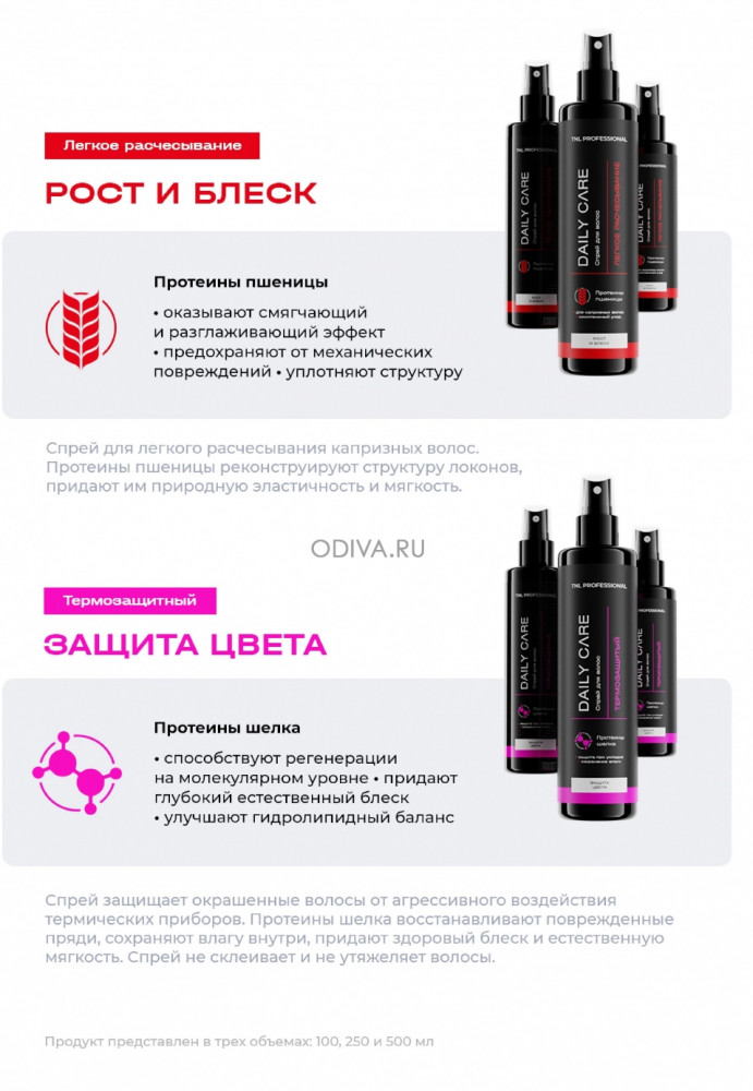 TNL Professional Спрей для волос термозащитный с протеинами шелка «Защита цвета»В данный момент этот товар отсутствует в продаже. Возможно, у нас найдется аналогичный или похожий товар здесь. Серия: Daily Care Спрей TNL Professional Daily Care «Защита цвета» термозащитный с протеинами шелка для окрашенных волос. Спрей защищает окрашенные волосы от агрессивного воздействия термических приборов. Протеины шелка восстанавливают поврежденные пряди, сохраняют влагу внутри, придают здоровый блеск и естественную мягкость. Спрей не склеивает и не утяжеляет волосы. Спрей TNL Professional Daily Care «Защита цвета» термозащитный с протеинами шелка придает гладкость и сияние, сохраняет насыщенность окрашенных волос. |