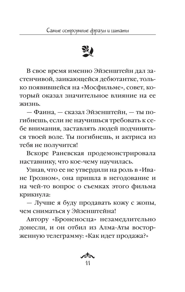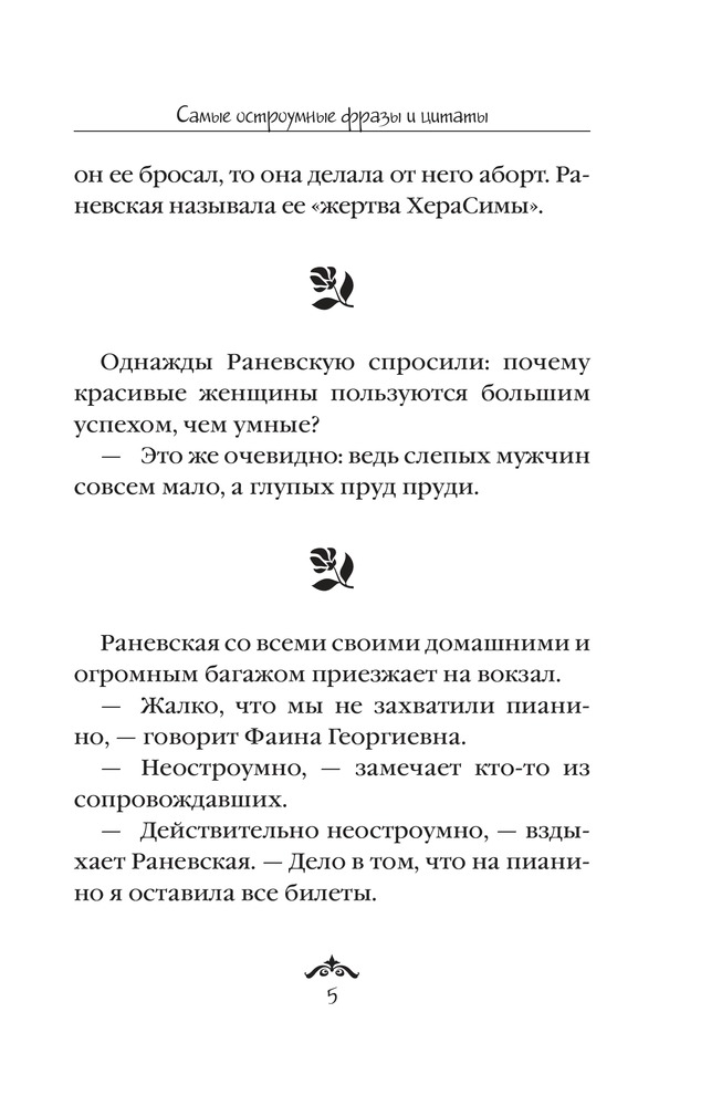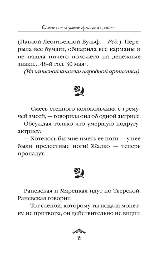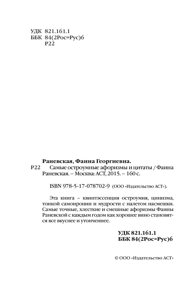 Самые остроумные афоризмы и цитатыВ данный момент этот товар отсутствует в продаже. Возможно, у нас найдется аналогичный или похожий товар здесь. Серия: Самые остроумные афоризмы и цитаты Эта книга — квинтэссенция остроумия, цинизма, тонкой самоиронии и мудрости с налетом насмешки. Самые точные, хлесткие и смешные афоризмы Фаины Раневской с каждым годом как хорошее вино становятся все вкуснее и утонченнее. |
