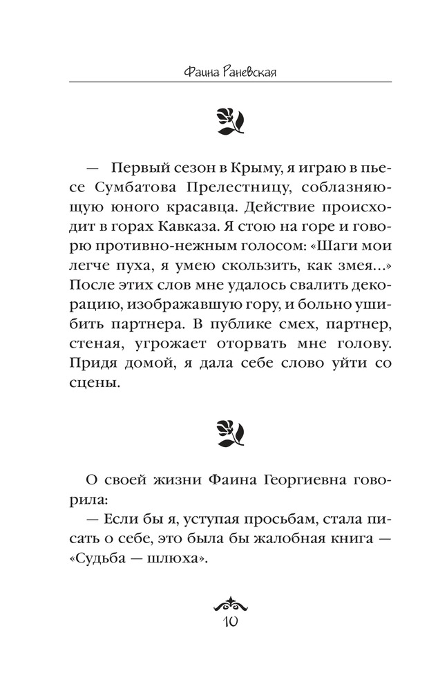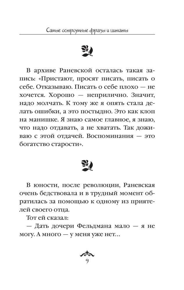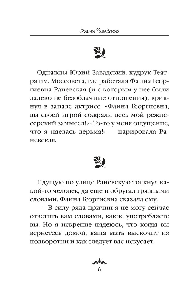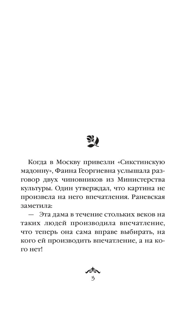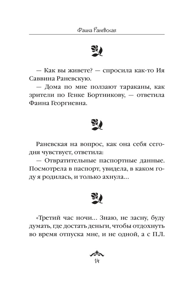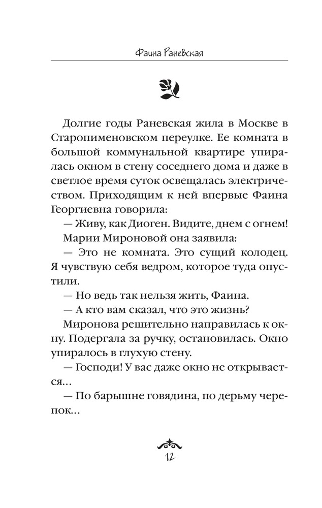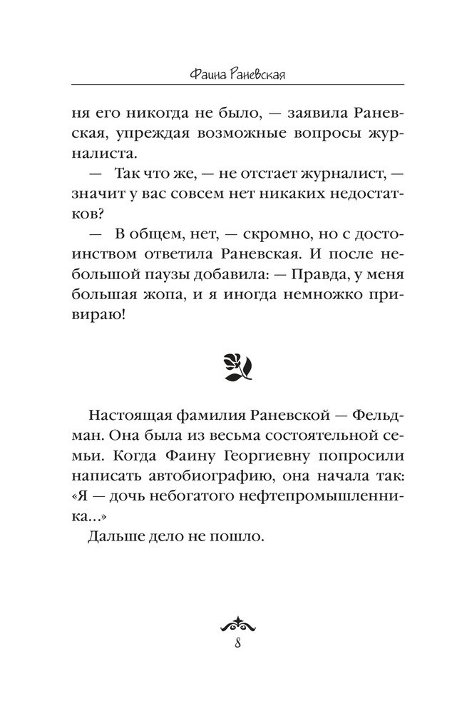Ожидала от книжки несколько большего. Прочитала буквально за час, очень тоненькая и крупный шрифт. Качество книжки хорошее - хорошая бумага, твердый переплет, но содержания маловато... Тем не менее рекомендую всем, кому дорога память об этой великой женщине - Фаине Раневской. Флип на высоте, как всегда, спасибо большое моему любимому магазину! Доставили даже раньше срока, девочки-операторы, менеджеры и курьеры очень вежливы, приятно иметь с вами дело!