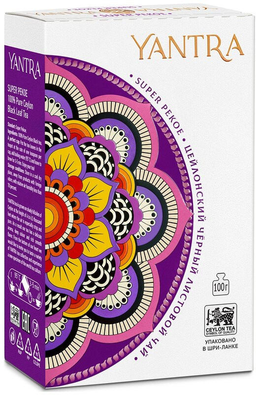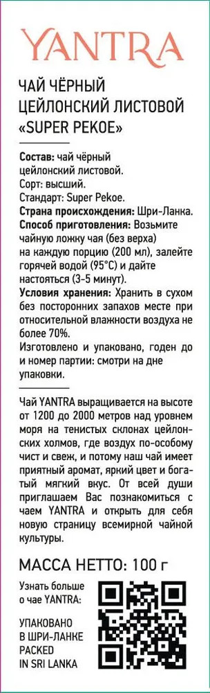Yantra Super Pekoe — Цейлонский черный крупнолистовой чай. Сорт Pekoe — чай из цельных листьев плотной скрутки. Этот способ изготовления создает красивый многогранный вкус с приятными сладковатыми нотами. Pekoe — это сорт пришедшей из Китая, где он назывался «Пак Хоа» (в переводе — два верхних листа и почка). Английские купцы изменили эти два слова на свой манер и говорили «Пеко». Для его изготовления используют два верхних молодых чайных листа. Их плотно скручивают в форму похожую на каплю, оставляют на ферментацию и сушат.