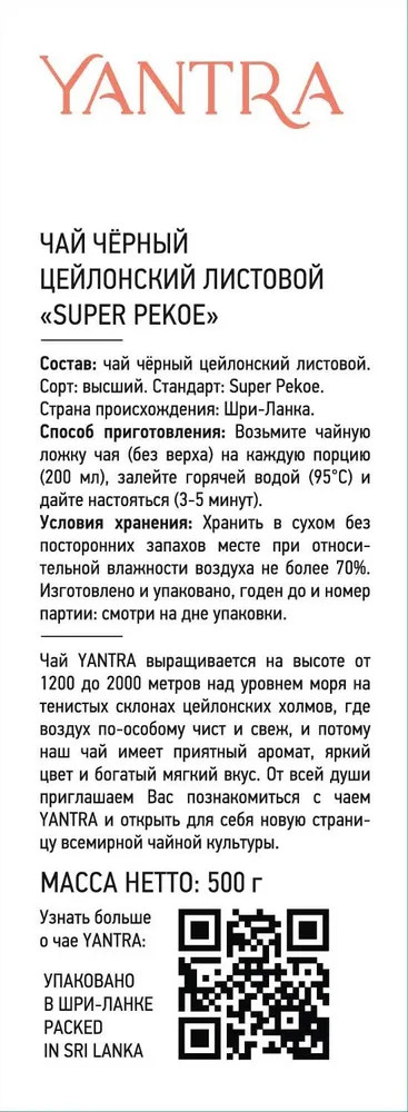 Yantra Super Pekoe — Цейлонский черный крупнолистовой чай. Сорт Pekoe — чай из цельных листьев плотной скрутки. Этот способ изготовления создает красивый многогранный вкус с приятными сладковатыми нотами. Pekoe — это сорт пришедшей из Китая, где он назывался «Пак Хоа» (в переводе — два верхних листа и почка). Английские купцы изменили эти два слова на свой манер и говорили «Пеко». Для его изготовления используют два верхних молодых чайных листа. Их плотно скручивают в форму похожую на каплю, оставляют на ферментацию и сушат.