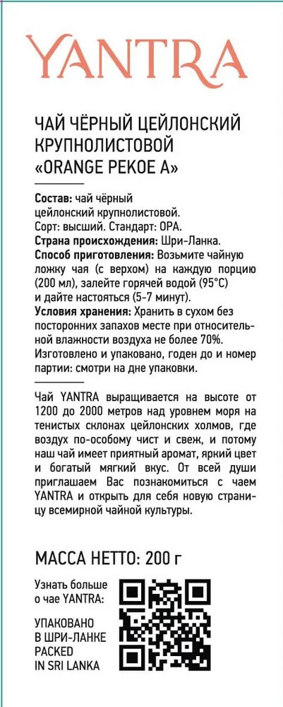 Yantra Orange Pekoe A — Цейлонский черный крупнолистовой чай. Особенность сорта Orange Pekoe в том, что листочки слегка скручиваются вдоль — это позволяет раскрыть яркий насыщенный цветочный аромат чайного листа, за который он так ценится.