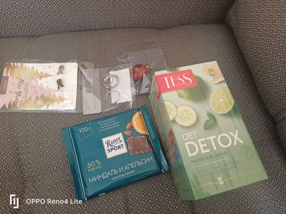 Доброго денёчка! Благодарю Flip.kz за такую прекрасную идею! С своём письме я обозначила, что люблю украшения и все, что блестит! Мой "Тайный Санта" положил мне ещё и шоколадку и чаек! Благодарю сердечно! Ждала как ребёнок!