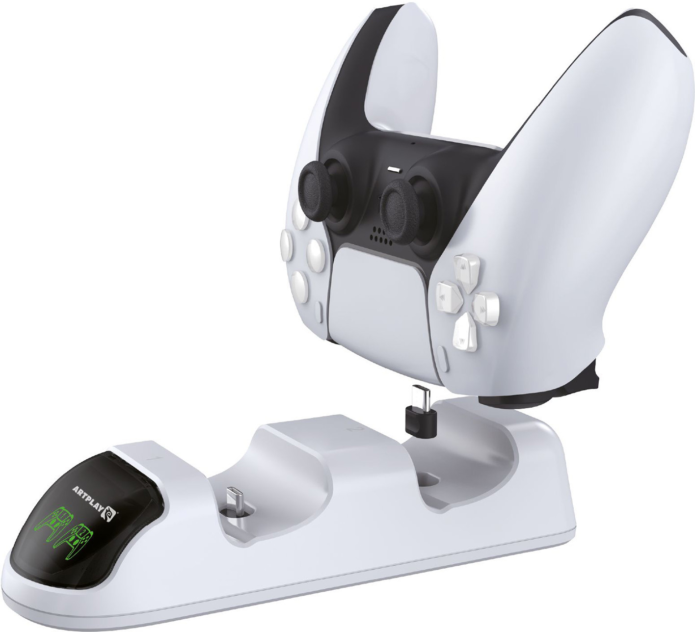 Зарядная станция для двух геймпадов DualSense PS5. Оснащается кабелем с разъемом USB, который можно подключить как к консоли, так и через совместимый адаптер переменного тока (в комплект не входит) к сеть питания 220В. Удобная LED индикация, расположенная на передней панели устройства, наглядно демонстрирует процесс зарядки контроллеров: если контроллер находится на стадии зарядки — индикатор горит красным, если зарядка завершена — меняется на зеленый. |