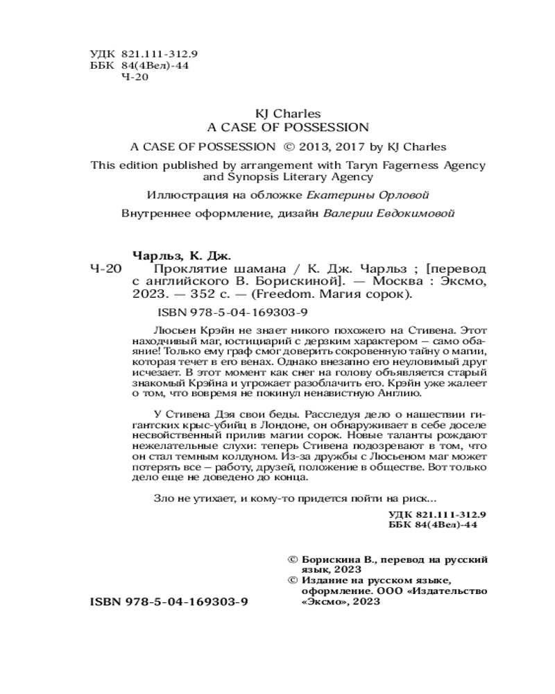 Проклятие шаманаВ данный момент этот товар отсутствует в продаже. Возможно, у нас найдется аналогичный или похожий товар здесь. Серия: Freedom. Магия сорок Люсьен Крэйн не знает никого похожего на Стивена Дэя. Этот находчивый маг, юстициарий с дерзким характером — само обаяние! Только ему граф смог доверить сокровенную тайну о магии, которая течет в его венах. Однако внезапно его неуловимый друг исчезает. В этот момент, как снег на голову, объявляется старый знакомый Крейна и угрожает разоблачить их отношения. Крэйн уже жалеет о том, что вовремя не покинул ненавистную Англию. |