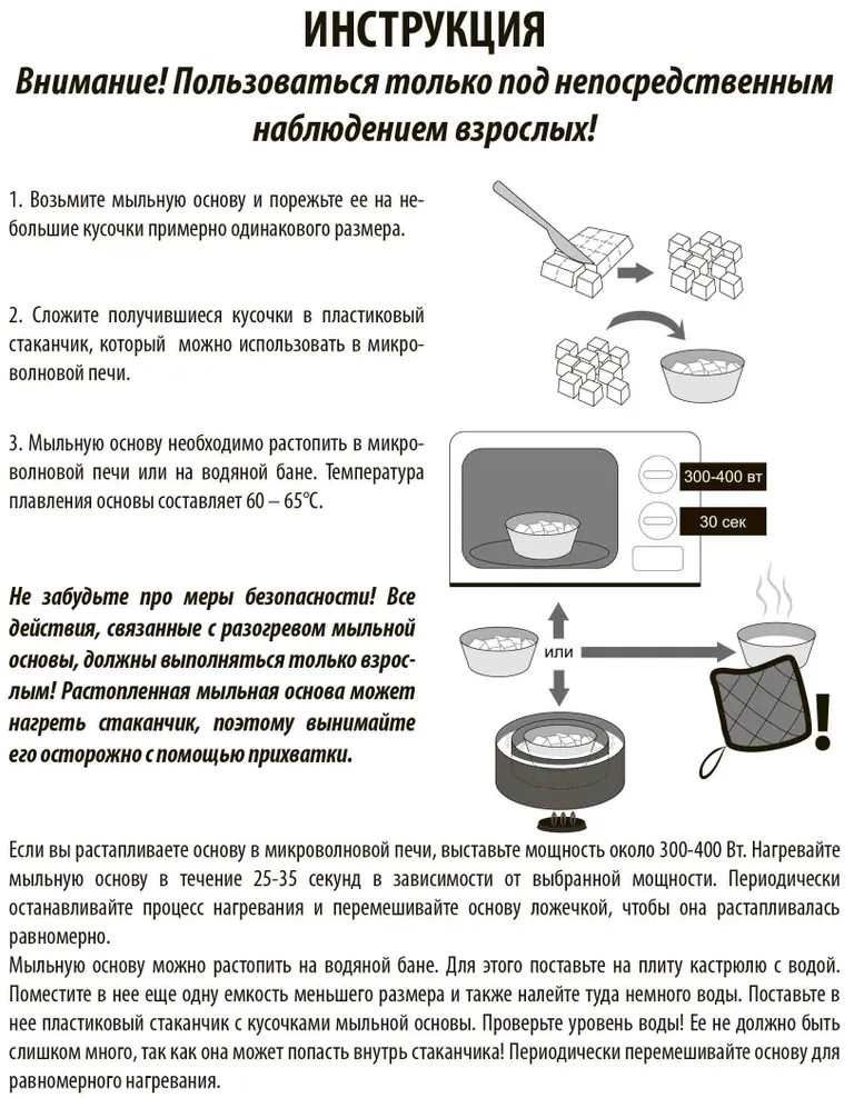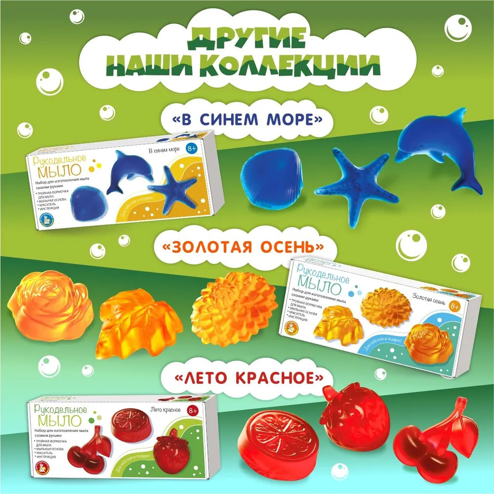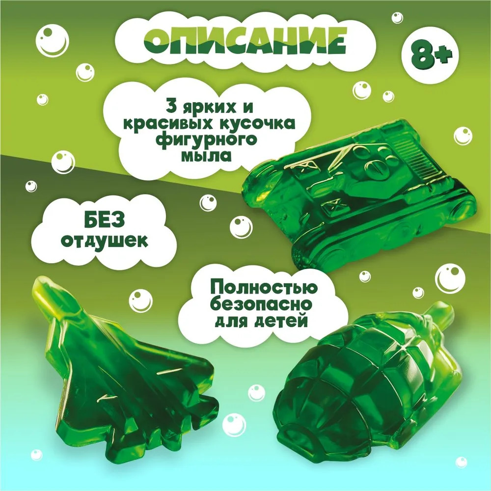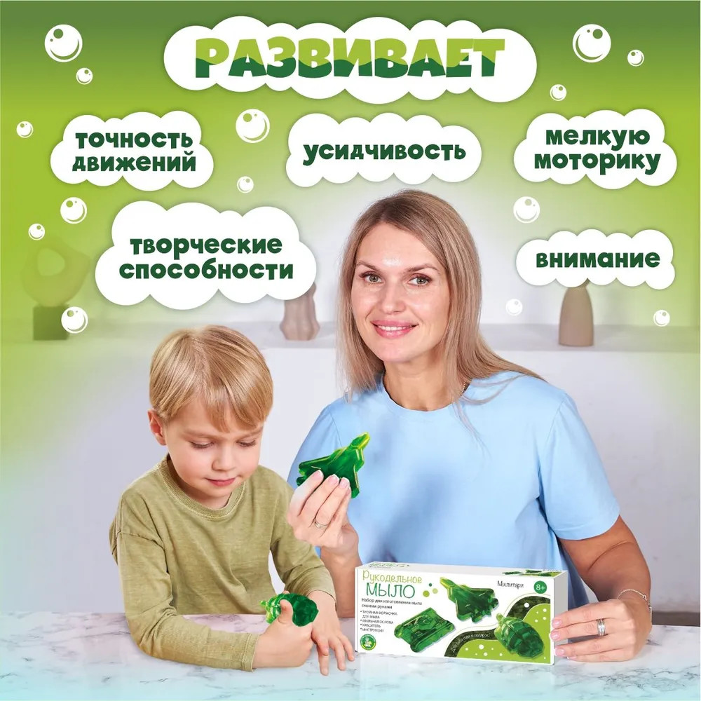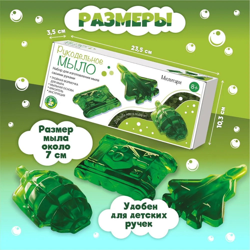 💳 Оплатить за товар можно при получении 🇰🇿 Есть бесплатная доставка по Казахстану от 1 дня 🎁 Копите бонусы с каждой покупки Серия: Рукодельное мыло Набор для изготовления мыла своими руками для детей «Милитари» входит в серию наборов «Рукодельное мыло». С его помощью можно создать сразу 3 ярких кусочка фигурного мыла в виде самолета, гранаты и танка. Набор для изготовления мыла своими руками развивает внимание, усидчивость, творческие способности и мелкую моторику ребёнка. |