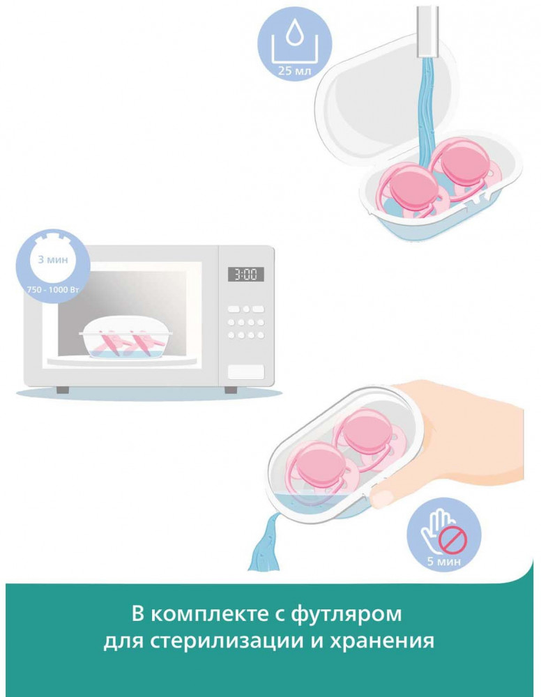 • дорожный футляр ultra air выполняет функцию стерилизатора — вам просто нужно добавить воды и положить его в микроволновую печь. Пустышка вновь будет чистой перед следующим использованием;