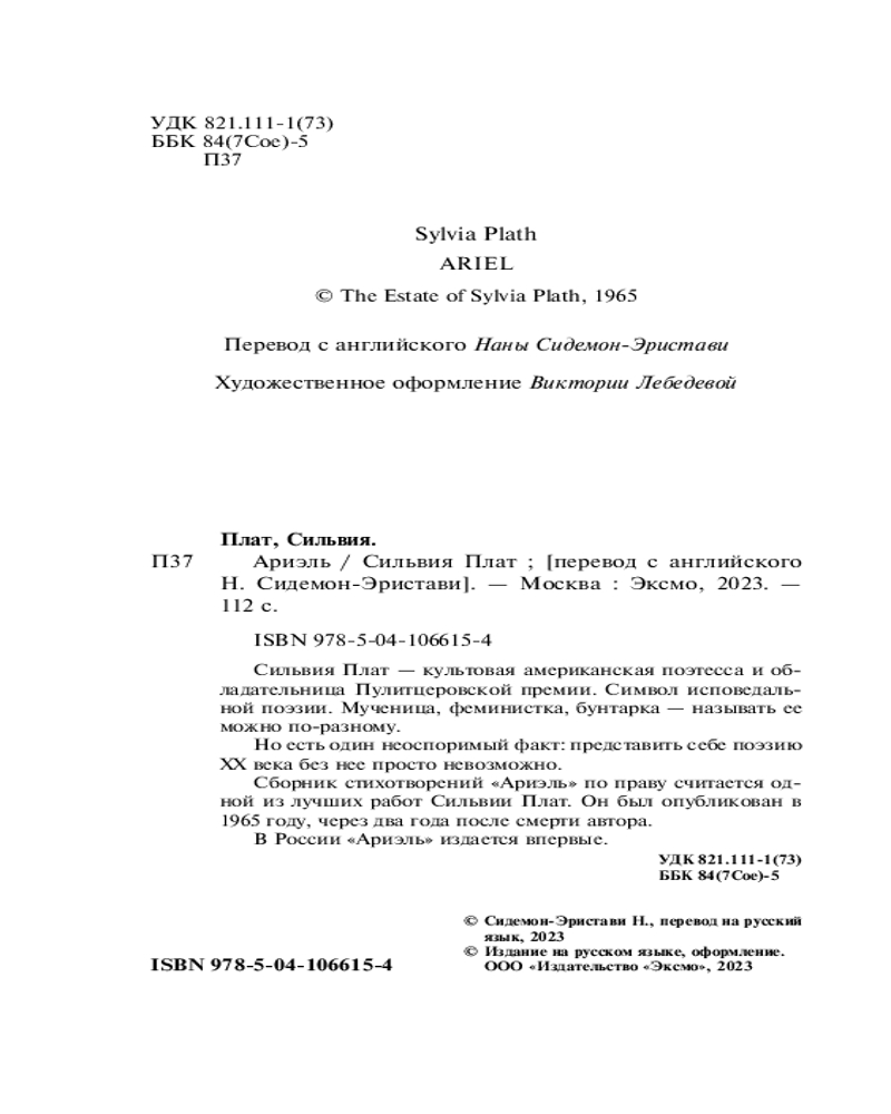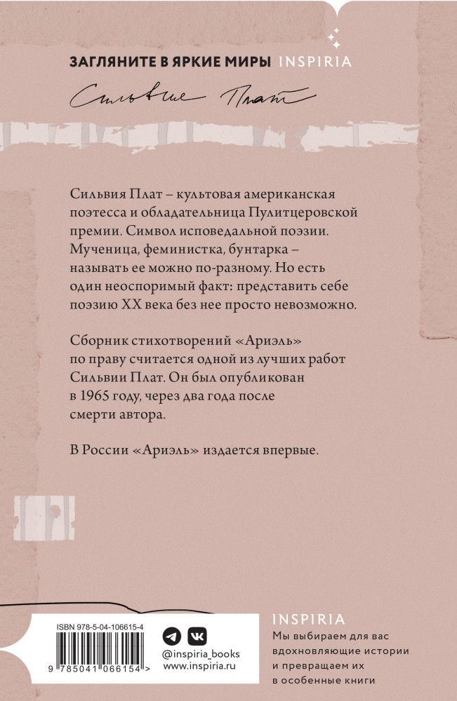 💳 Оплатить за товар можно при получении 🇰🇿 Есть бесплатная доставка по Казахстану от 1 дня 🎁 Копите бонусы с каждой покупки Серия: Inspiria Air Сильвия Плат — культовая американская поэтесса и обладательница Пулитцеровской премии. Символ исповедальной поэзии. Мученица, феминистка, бунтарка — называть ее можно по-разному. Но есть один неоспоримый факт: представить себе поэзию XX века без нее просто невозможно. Сборник стихотворений «Ариэль» по праву считается одной из лучших работ Сильвии Плат. Он был опубликован в 1965 году, через два года после смерти автора. В России «Ариэль» издается впервые. |