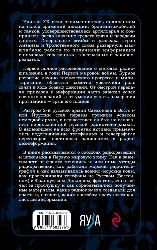 💳 Оплатить за товар можно при получении 🇰🇿 Есть бесплатная доставка по Казахстану от 1 дня 🎁 Копите бонусы с каждой покупки Серия: Военная разведка Начало ХХ века озменовалось появлением на полях сражений авиации, бронеавтомобилей и танков, усовершенствовалась артиллерия и боеприпасы, росло значение средств связи и передачи данных. Генеральные штабы и разведка стран Антанты и Тройственного союза развернули масштабную работу по получению информации с помощью перехватов телефонных, телеграфных и радиоперехватов. |