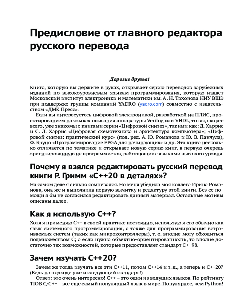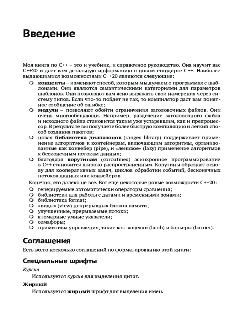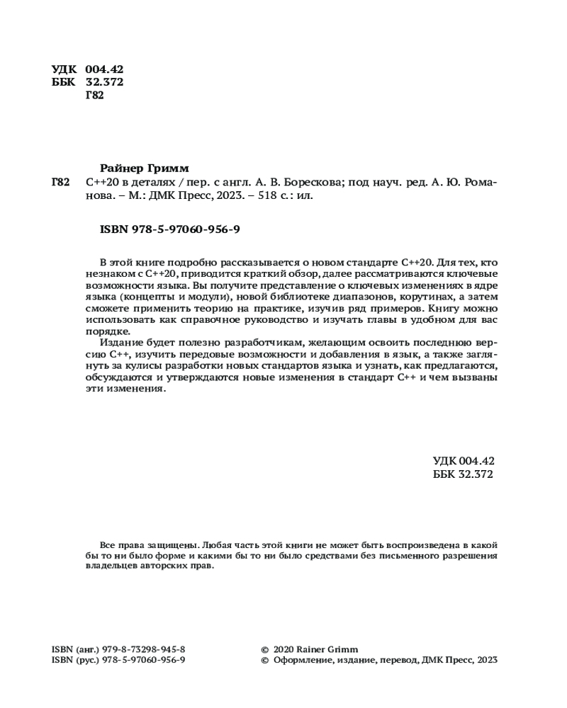 💳 Оплатить за товар можно при получении 🇰🇿 Есть бесплатная доставка по Казахстану от 1 дня 🎁 Копите бонусы с каждой покупки В этой книге подробно рассказывается о новом стандарте С++20. Для тех, кто незнаком с С++20, приводится краткий обзор, далее рассматриваются ключевые возможности языка. Вы получите представление о ключевых изменениях в ядре языка (концепты и модули), новой библиотеке диапазонов, корутинах, а затем сможете применить теорию на практике, изучив ряд примеров. Книгу можно использовать как справочное руководство и изучать главы в удобном для вас порядке. |
