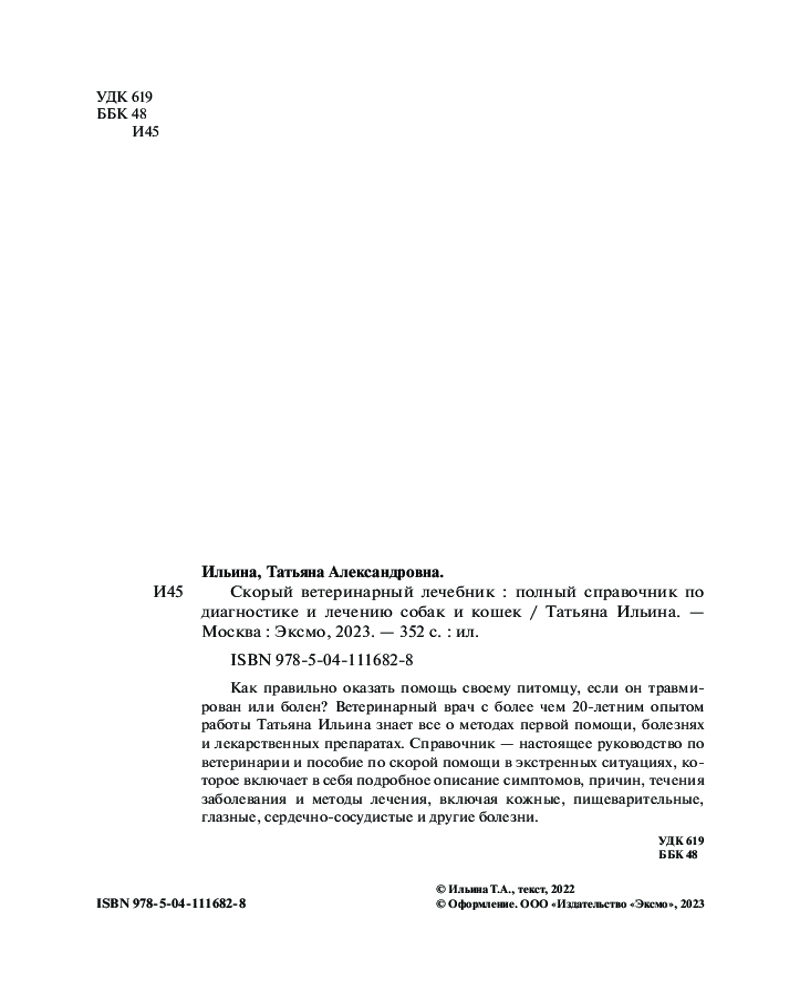 Скорый ветеринарный лечебник. Полный справочник по диагностике и лечению собак и кошекВ данный момент этот товар отсутствует в продаже. Возможно, у нас найдется аналогичный или похожий товар здесь. Серия: Домашние питомцы. Уход, здоровье, воспитание Волнуетесь за здоровье своего питомца, но не знаете, как ему помочь? Не знаете, что будете делать, если вдруг от вас будет зависеть жизнь вашего четвероногого, а ближайшая ветеринарная клиника находится за тысячи километров? Или вы только собираетесь завести нового друга и переживаете, что не сможете оказать ему нужного ухода и помощи? Это издание поможет самостоятельно справиться с самыми распространенными проблемами, с которыми сталкиваются многие владельца собак и кошек. |