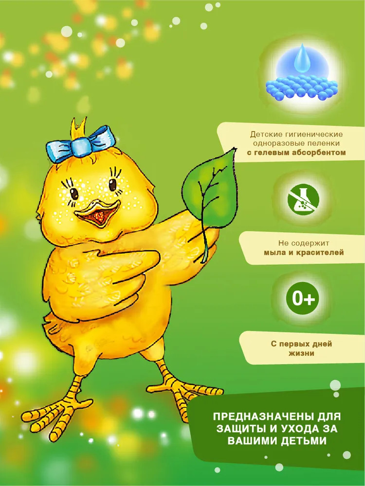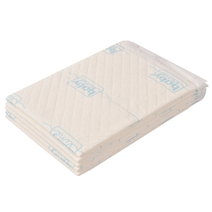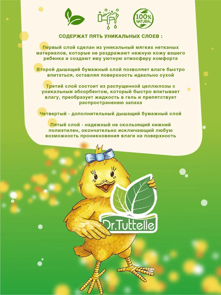 Первый слой сделан из уникальный мягких нетканых материалов, которые не раздражают нежную кожу вашего ребенка и создают ему уютную атмосферу комфорта. Второй дышащий бумажный слой позволяет влаге быстро впитаться, оставляя поверхность идеально сухой. Третий слой состоит из распущенной целлюлозы с уникальным абсорбентом, который быстро впитывает влагу, преобразует жидкость в гель и препятствует распространению запаха. Четвертый — дополнительный дышащий бумажный слой. Пятый слой — надежный не скользящий нижний полиэтилен, окончательно исключающий любую возможность проникновения влаги на поверхность.