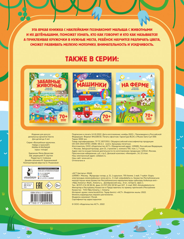 💳 Оплатить за товар можно при получении 🇰🇿 Есть бесплатная доставка по Казахстану от 1 дня 🎁 Копите бонусы с каждой покупки Серия: Волшебные кружочки. Найди и приклей! Эта яркая книжка с наклейками познакомит малыша с животными и их детёнышами, поможет узнать, кто как говорит и кто как называется! А приклеивая кружочки в нужные места, ребёнок научится различать цвета, сможет развивать мелкую моторику, внимательность и усидчивость. |