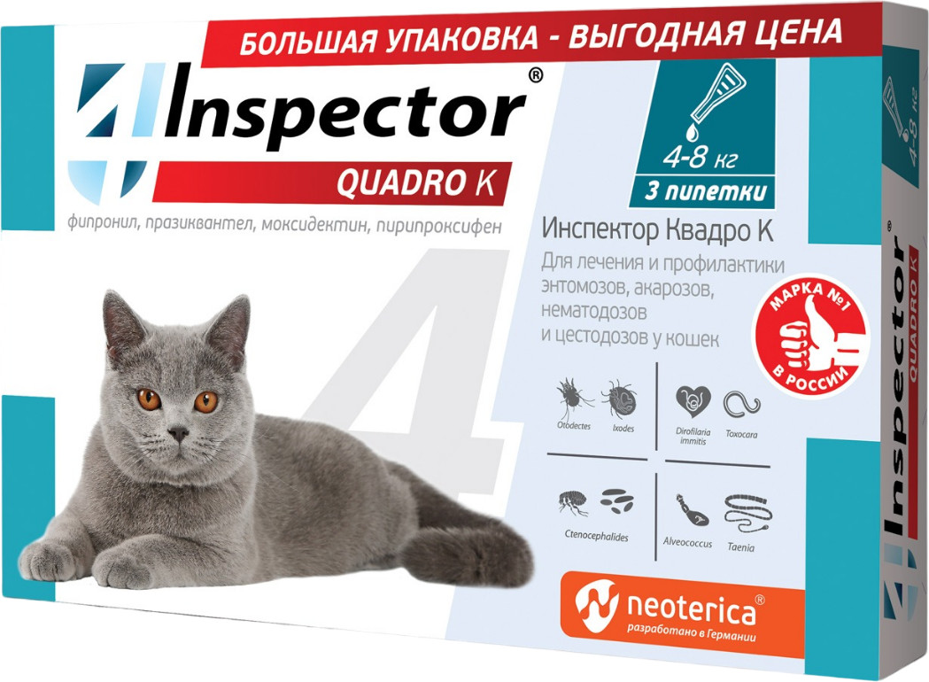 💳 Оплатить за товар можно при получении 🇰🇿 Есть бесплатная доставка по Казахстану от 1 дня 🎁 Копите бонусы с каждой покупки Капли на холку для кошек от 4 кг до 8 кг. Наши кошки под постоянной угрозой заражения эктопаразитами (клещей, блох и др.) и эндопаразитами (гельминтами, в простонародье глисты). Для надёжной и всесторонней защиты от внешних и внутренних паразитов используйте препараты «Inspector». |