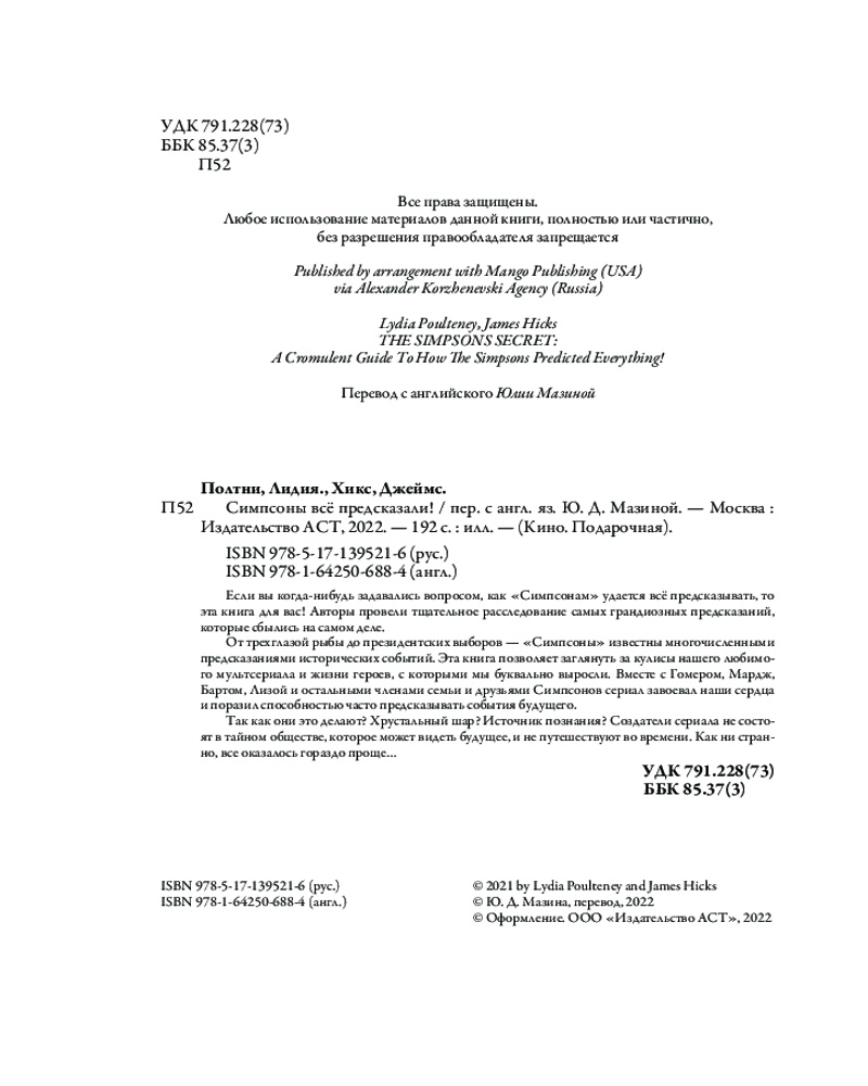 💳 Оплатить за товар можно при получении 🇰🇿 Есть бесплатная доставка по Казахстану от 1 дня 🎁 Копите бонусы с каждой покупки Серия: Кино. Подарочная Лидия Полтни и Джеймс Хикс — супружеская пара, в 2020 году создавшая популярный канал The Simpsons Theory на YouTube. В своих видео основное внимание они уделяют загадкам шоу. Оба получили степень бакалавра искусств: Лидия — в области теории и практики кино, а Джеймс — в области медиапроизводства. |