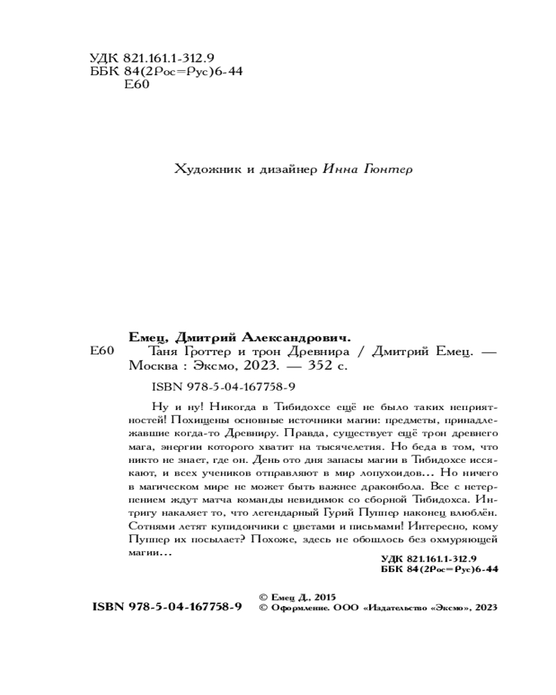 💳 Оплатить за товар можно при получении 🇰🇿 Есть бесплатная доставка по Казахстану от 1 дня 🎁 Копите бонусы с каждой покупки Серия: Детск. Таня Гроттер: юбилейное издание Серия «Таня Гроттер» завоевала сердца миллионов читателей. История о юной волшебнице изначально создавалась как пародия на «Гарри Поттера», но со временем обрела неповторимые черты. В ней появились уникальные сюжетные линии и новые герои. Особый шарм «Тане Гроттер» придает обращение автора к русской мифологии. В этом году у серии юбилей — 20 лет на российском рынке! |