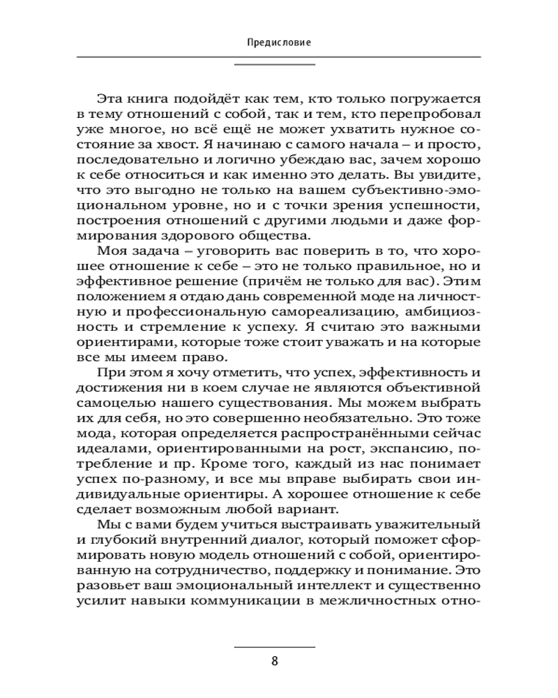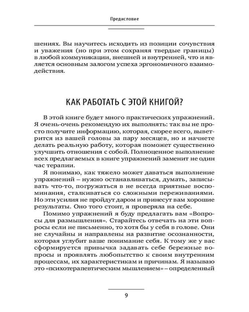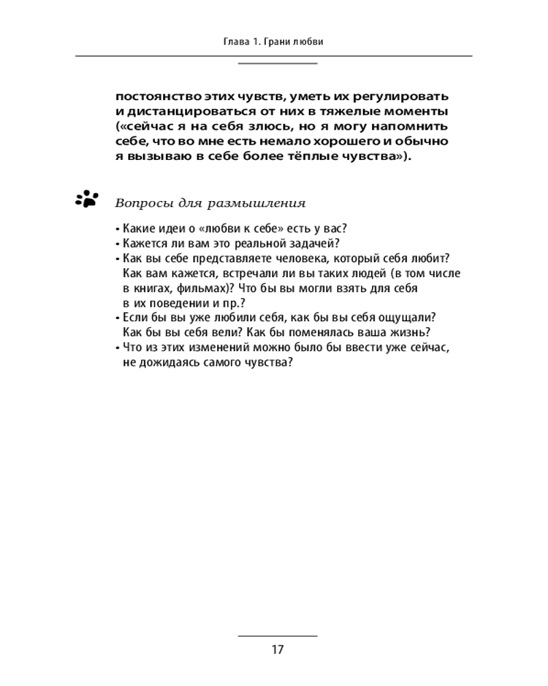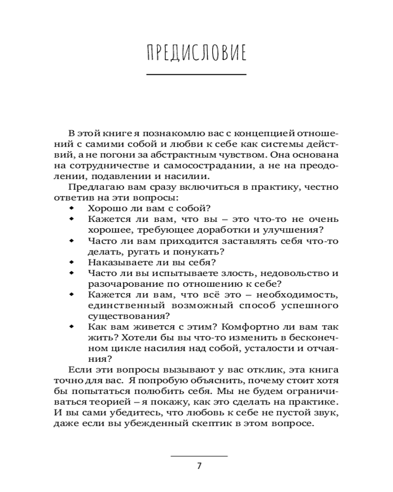прекрасная книга, отношение к читателю заботливое и понимающее. Автор хорошо понимает как себя чувствует и что думает человек, у которого есть проблемы в отношениях с собой. есть много вопросов для размышления и практических заданий. книга нацелена не на манипуляцию взглядами человека, а на достижение реальных результатов при текущем состоянии и возможностях человека здесь и сейчас. читайте!