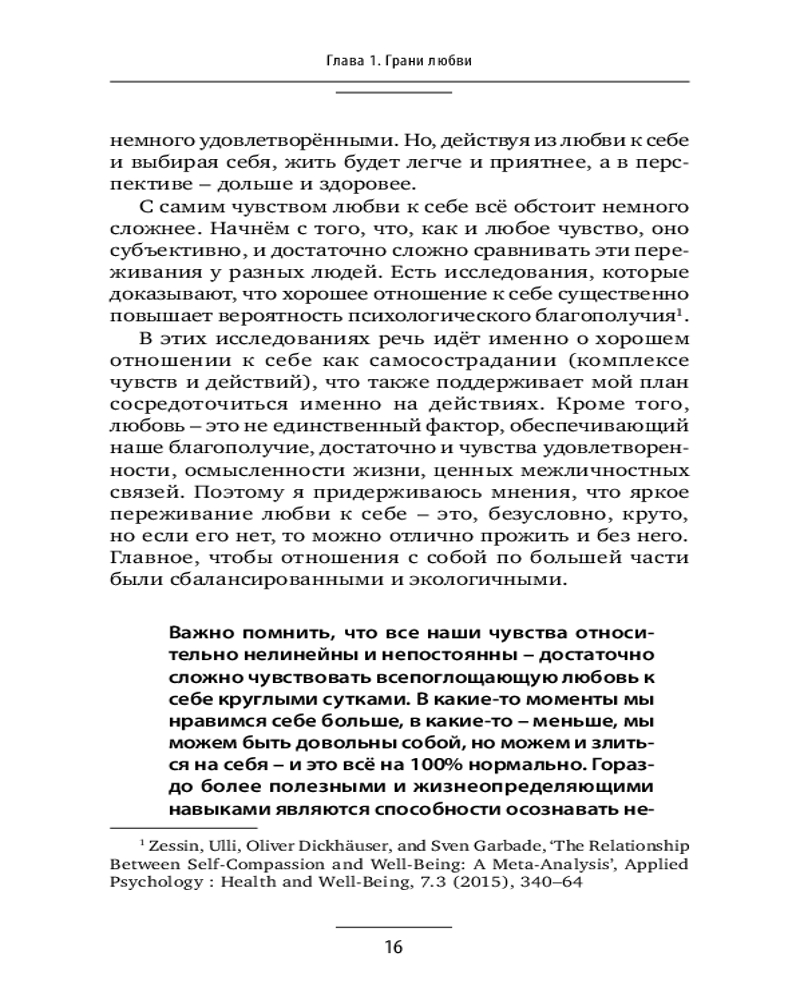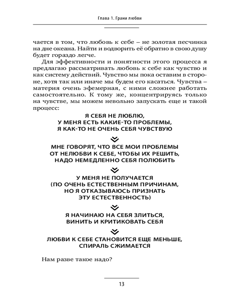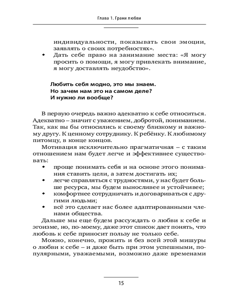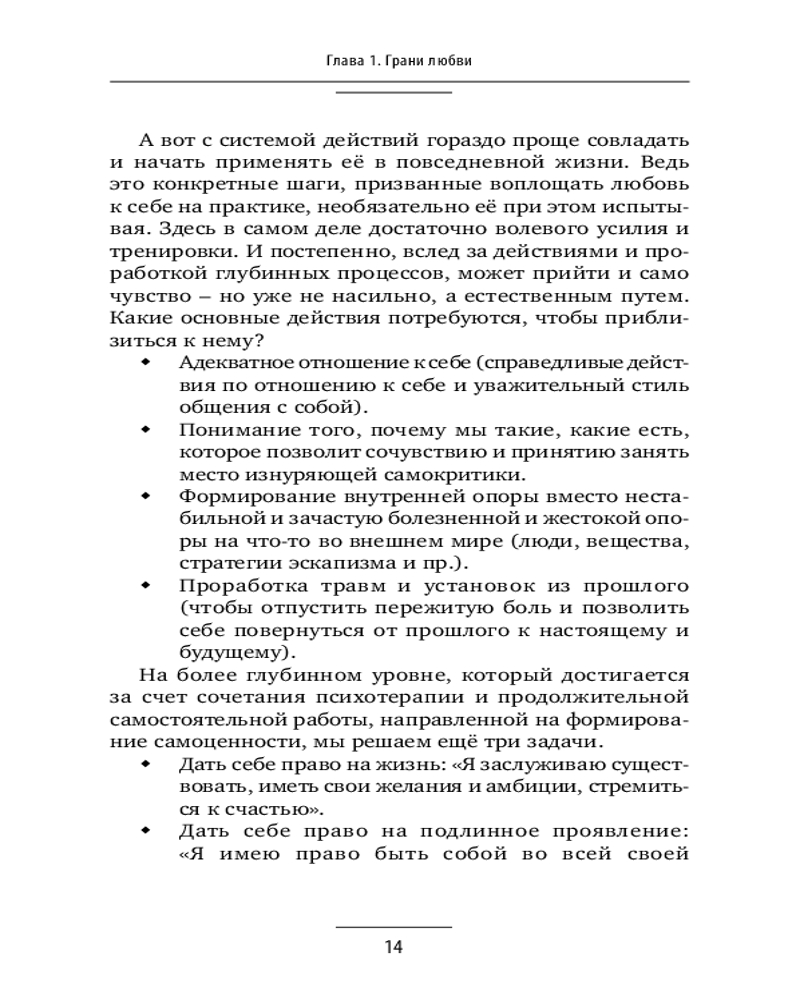 прекрасная книга, отношение к читателю заботливое и понимающее. Автор хорошо понимает как себя чувствует и что думает человек, у которого есть проблемы в отношениях с собой. есть много вопросов для размышления и практических заданий. книга нацелена не на манипуляцию взглядами человека, а на достижение реальных результатов при текущем состоянии и возможностях человека здесь и сейчас. читайте!