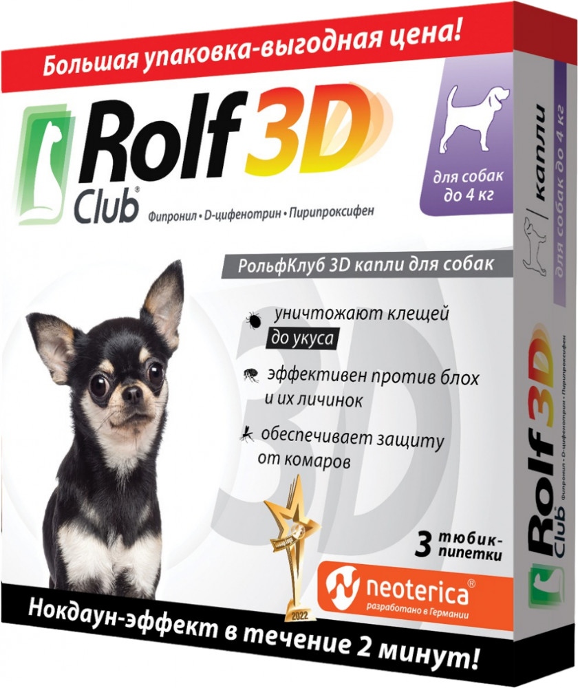 RolfClub 3D Капли на холку для собак от блох, клещей, насекомых (1-4 кг)-20% +204