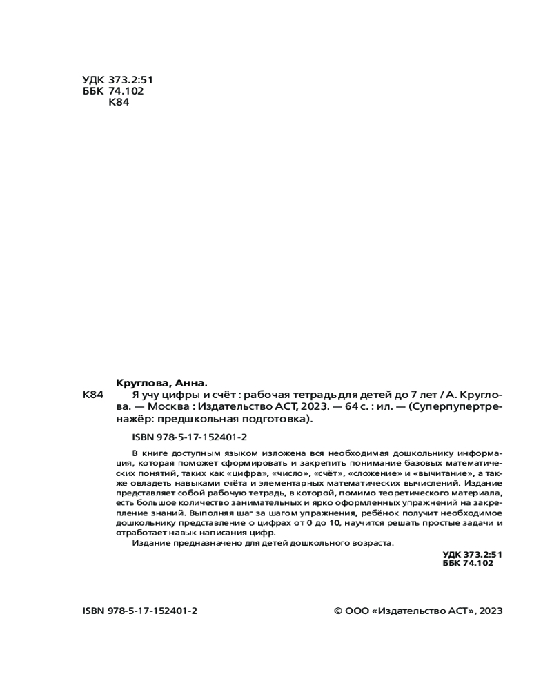 💳 Оплатить за товар можно при получении 🇰🇿 Есть бесплатная доставка по Казахстану от 1 дня 🎁 Копите бонусы с каждой покупки Серия: Суперпупертренажёр: предшкольная подготовка В книге доступным языком изложена вся необходимая дошкольнику информация, которая поможет сформировать и закрепить понимание базовых математических понятий, таких как «цифра», «число», «счёт», «сложение» и «вычитание», а также овладеть навыками счёта и элементарных математических вычислений. Издание представляет собой рабочую тетрадь, в которой, помимо теоретического материала, есть большое количество занимательных и ярко оформленных упражнений на закрепление знаний. Выполняя шаг за шагом упражнения, ребёнок получит необходимое дошкольнику представление о цифрах от 0 до 10, научится решать простые задачи и отработает навык написания цифр. Издание предназначено для детей дошкольного возраста. |