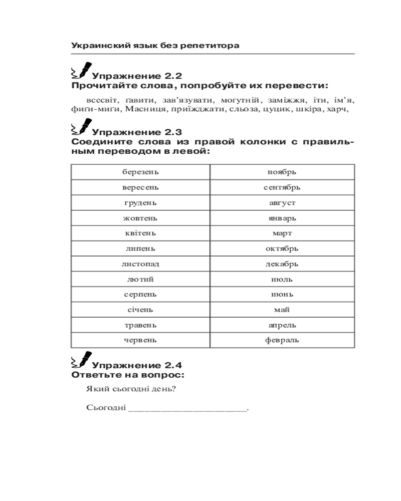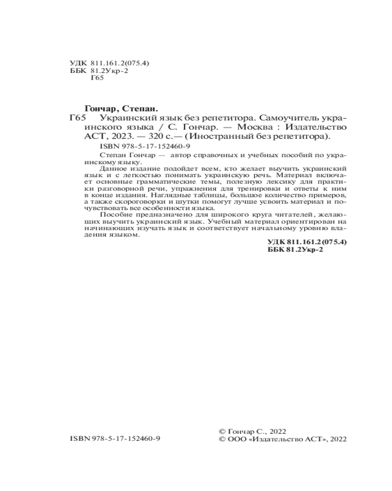 Украинский язык без репетитора. Самоучитель украинского языкаВ данный момент этот товар отсутствует в продаже. Возможно, у нас найдется аналогичный или похожий товар здесь. Серия: Иностранный без репетитора Данное издание подойдет всем, кто желает выучить украинский язык и с легкостью понимать украинскую речь. Материал включает основные грамматические темы, полезную лексику для практики разговорной речи, упражнения для практики и ответы к ним в конце издания. Наглядные таблицы, большое количество примеров, а также скороговорки и шутки помогут лучше усвоить материал и почувствовать все особенности языка. |
