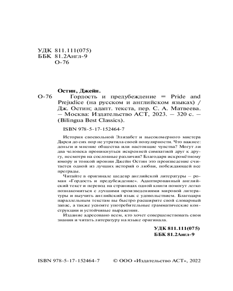 💳 Оплатить за товар можно при получении 🇰🇿 Есть бесплатная доставка по Казахстану от 1 дня 🎁 Копите бонусы с каждой покупки Серия: Bilingua Best Classics История своевольной Элизабет и высокомерного мистера Дарси до сих пор не утратила своей популярности. Что важнее: деньги и мнение общества или настоящие чувства? Могут ли два человека проникнуться искренней симпатией друг к другу, несмотря на сословные различия? Благодаря искромётному юмору и тонкой иронии Джейн Остин это произведение считается одной из лучших историй о любви, побеждающей все преграды. |