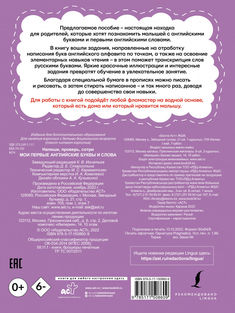 💳 Оплатить за товар можно при получении 🇰🇿 Есть бесплатная доставка по Казахстану от 1 дня 🎁 Копите бонусы с каждой покупки Серия: Напиши, проверь, сотри Предлагаемая книга — настоящая находка для родителей, которые хотят познакомить малышей с английскими буквами и первыми английскими словами. В книгу вошли задания, направленные на отработку написания букв английского алфавита по точкам, а также на освоение элементарных навыков чтения — в этом поможет транскрипция слов русскими буквами. Яркие красочные иллюстрации и интересные задания превратят обучение в увлекательное занятие. Благодаря специальной бумаге в прописях можно писать и рисовать, а затем стирать написанное — и так много раз, доводя до совершенства свои навыки. Для работы с книгой подойдет любой фломастер на водной основе, который есть дома или который нравится малышу. |