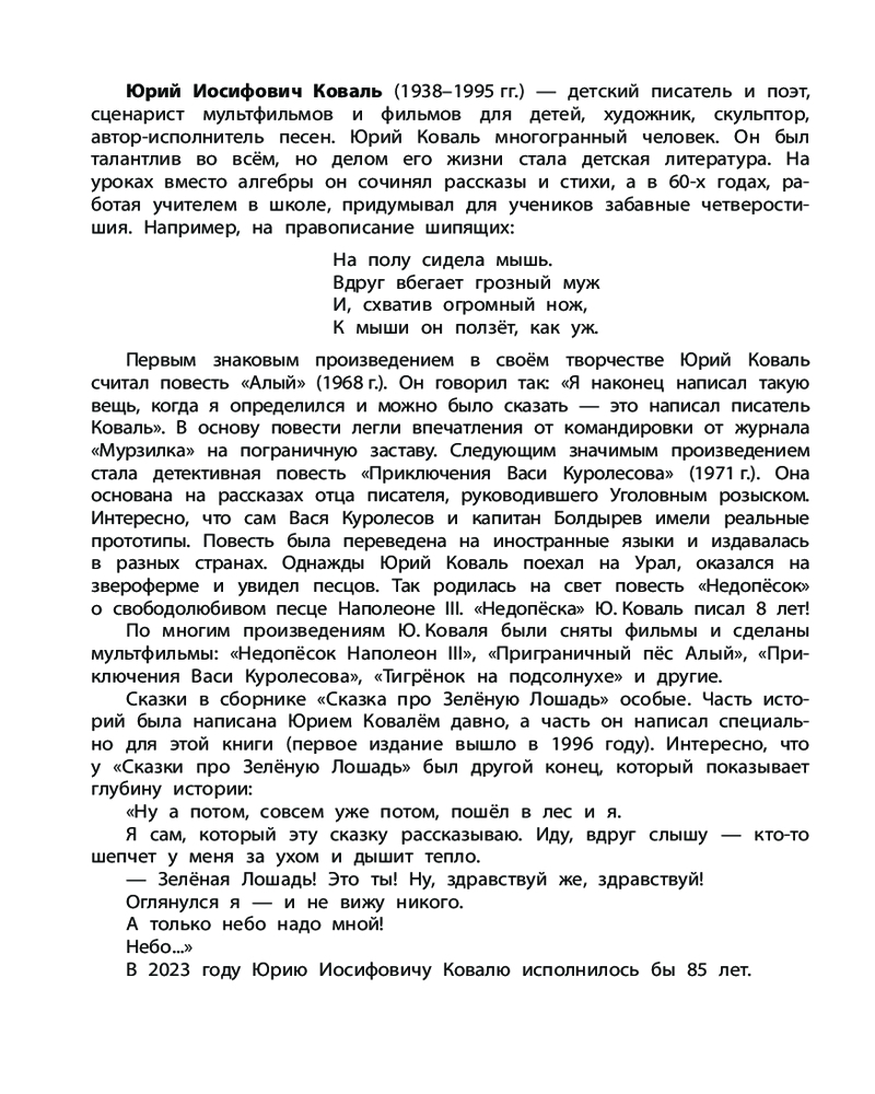💳 Оплатить за товар можно при получении 🇰🇿 Есть бесплатная доставка по Казахстану от 1 дня 🎁 Копите бонусы с каждой покупки Серия: Лучшие сказочники Юрий Коваль — необычный писатель. У него свой особый язык повествования, поэтому его произведения невозможно спутать ни с какими другими. В нашу книгу вошли сказки писателя — «Сказка про Зелёную Лошадь», «Сказка про тигрёнка на подсолнухе», «Сказка про рыжего братишку» и другие. Они отличаются оригинальным сюжетом, удивительным даже для сказки. К парикмахеру по имени Кремдлярук в окно стучится странная рыжая голова, мальчик Алёша находит в шоколадных яйцах живых человечков, а уссурийский тигрёнок просыпается на подсолнухе. Сказки не только увлекут читателей, но и позволят задуматься о важном. Каждый найдёт в книге что-то своё. |