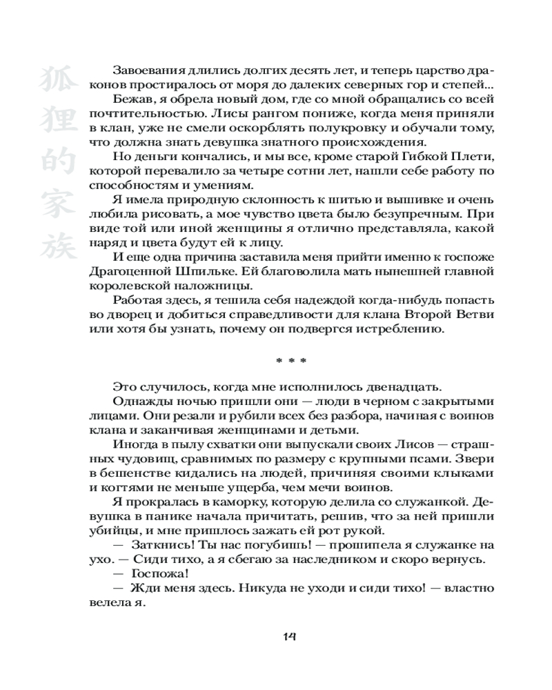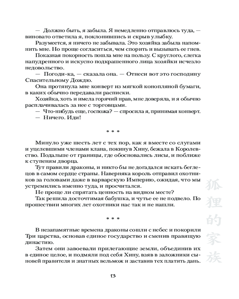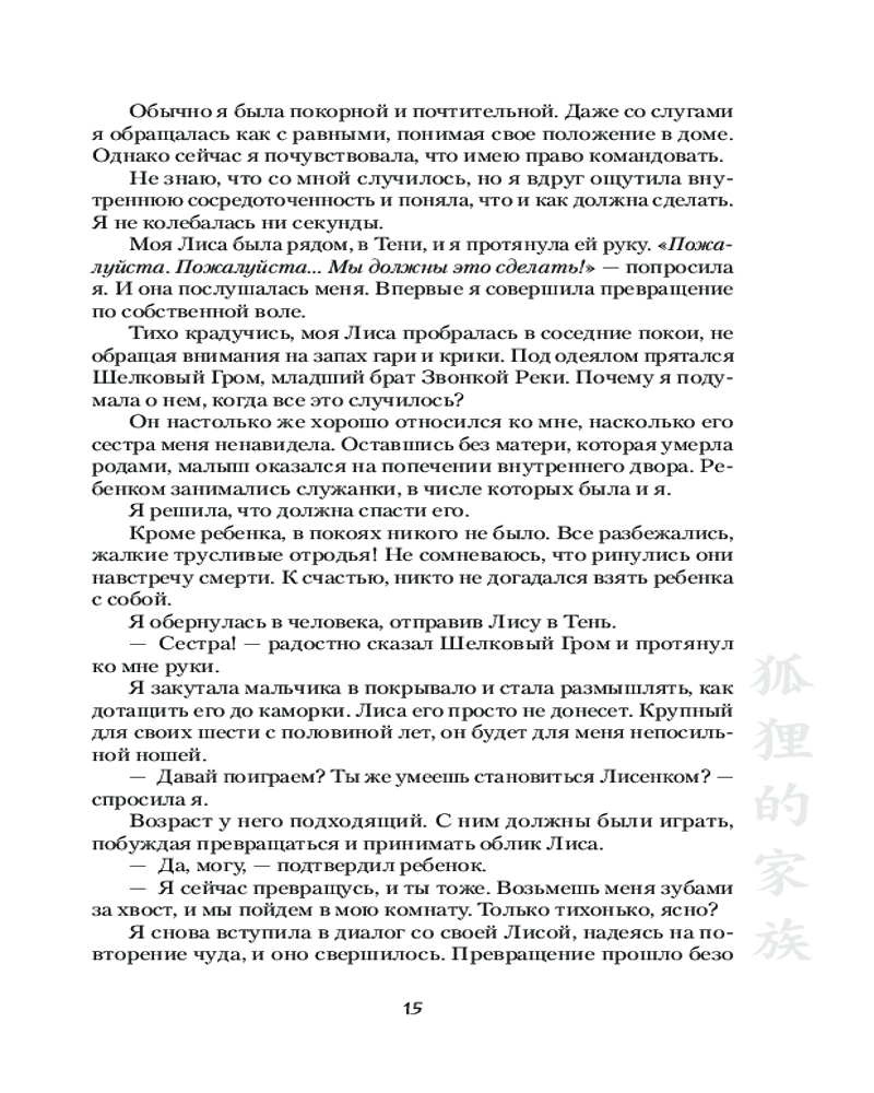 «Не суди книгу по обложке» – поговорка , что стара как мир, однако возымела одно исключение, и этим исключением я могу назвать именно “Лисий дом„ Бумажная версия. Невероятное оформление бумажной версии книги сразу же покорило мое сердце. Я не могла налюбоваться обложкой с главными героями, такими красивыми их нарисовали! А как хорош форзац, что сразу окунает в атмосферу средневековой Азии! К тому же, мне в подарок к книге досталась чудесная открытка, поэтому я несказанно рада! Перейдем непосредственно к самому произведению, как я упоминала ранее, внутреннее содержание ничуть не уступает внешнему лоску. Не стану пересказывать сюжет, его можете прочитать в аннотации, поэтому перейду к ключевым моментам. Слог автора. Он восхитителен, ощущается как патока на языке, хочется смаковать и пробовать и с каждым разом желаешь большего. Так много вкусов, так много цветов, я буквально с головой потонула в этой эйфорической буре, атмосфере волшебной Азии. Автор проделала просто колоссальную работу, ведь именно в этой книге, каждое слово имеет смысл, каждое действие потайное дно. Как же мне было приятно читать её двустишия! Просто услада для глаз и работа для разума, ведь прежде чем прочитать обозначение, я пыталась понять смысл сама, и о чудо! К концу произведения я действительно наловчилась и научилась сходу понимать изысканные стихи, что заменяли героям грубые слова. Повествование. Повествование ведётся неспеша, чтобы читатель смог полностью погрузиться в мир, и насытиться этими сладкими явствами до конца! Детективная линия была довольно интересной, и наблюдать за процессом решения задач, тоже приносило несказанное удовольствие. Описание различных одежд, видов ткани и вышивки занимают львиную долю истории, однако отнюдь ничего не портит а наоборот добавляет колорита и передаёт настроение всей истории. Итог. Подытоживая могу сказать, что книгу я настоятельно рекомендуем всем, кого хоть немного интересует тема востока, ведь здесь ваши познания о лечебных травах, значениях шелковых одежд и двустишиях значительно увеличится! История лёгкая, но не теряет реализма, здесь явственно показаны различия в социальных статусах и привилегиях людей властных и богатых, показана жизнь роскошная и жизнь скромная, всё в сравнении. Много интересных и философских идея для размышления, поэтому пища для ума обеспечена. Книга чудесная, после неё остаётся безумно приятное послевкусие, словно испила сладкого чая из лепестков весенних цветов. P.S. Очень жду продолжения выхода в бумаге, но кажется не удержусь и прочитаю продолжение в электронке, пожалейте мне удачи.