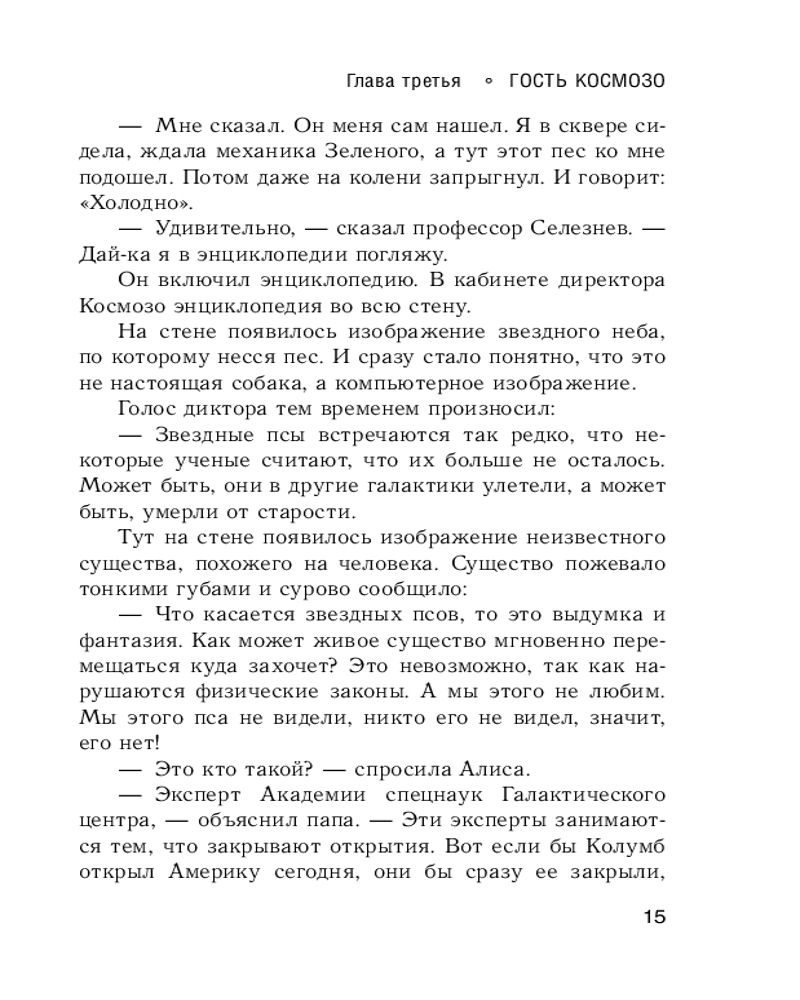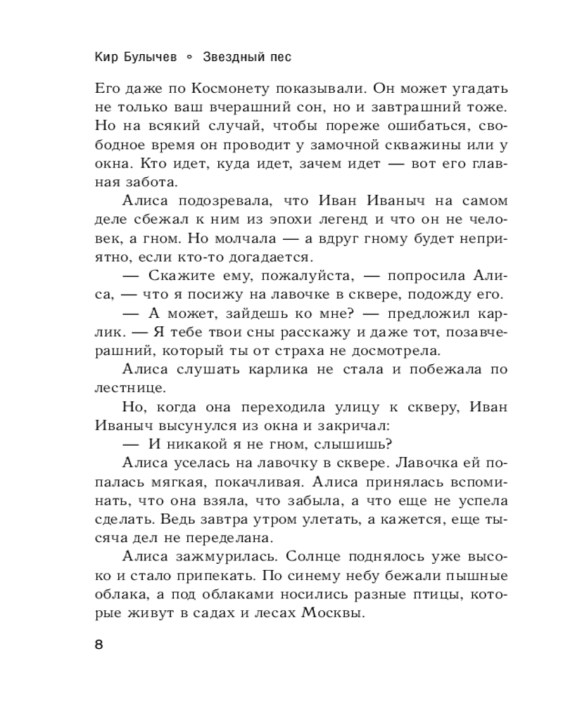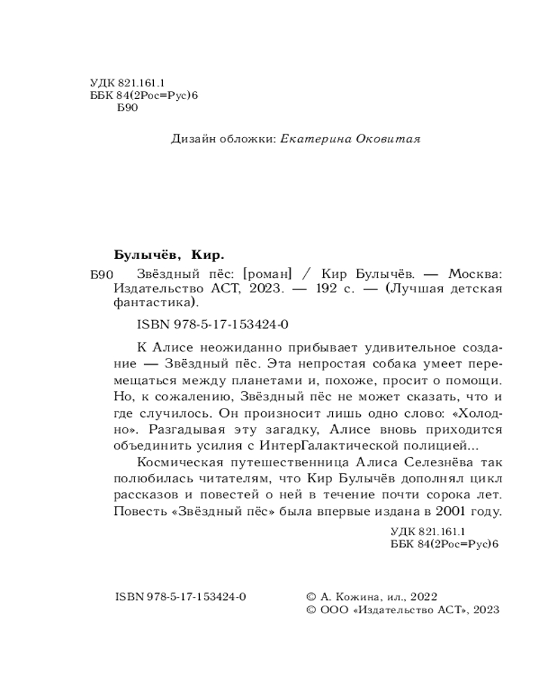 Звёздный пёсВ данный момент этот товар отсутствует в продаже. Возможно, у нас найдется аналогичный или похожий товар здесь. Серия: Лучшая детская фантастика К Алисе неожиданно прибывает удивительное создание — Звездный пес. Эта непростая собака умеет перемещаться между планетами и, похоже, просит о помощи. Но, к сожалению, Звездный пес не может сказать, что и где случилось. Он произносит лишь одно слово: «Холодно». Разгадывая эту загадку, Алисе вновь приходится объединить усилия с ИнтерГалактической полицией... Космическая путешественница Алиса Селезнева так полюбилась читателям, что Кир Булычев дополнял цикл рассказов и повестей о ней в течение почти сорока лет. Повесть «Звездный пес» была впервые издана в 2001 году. |