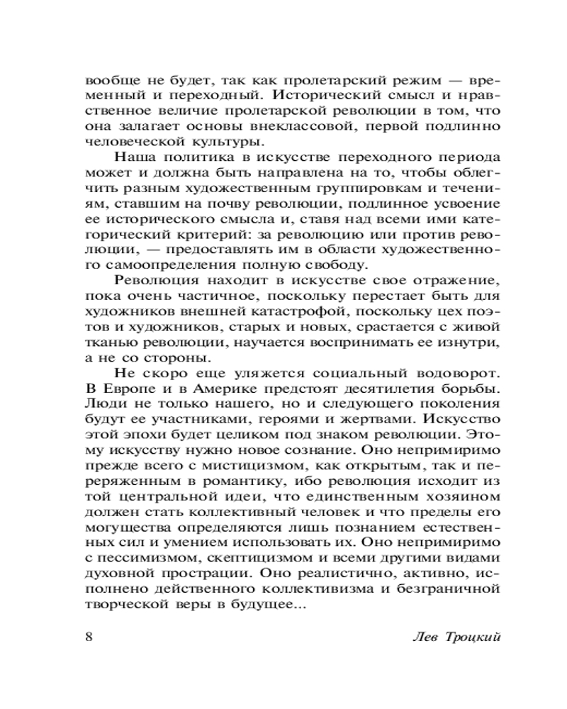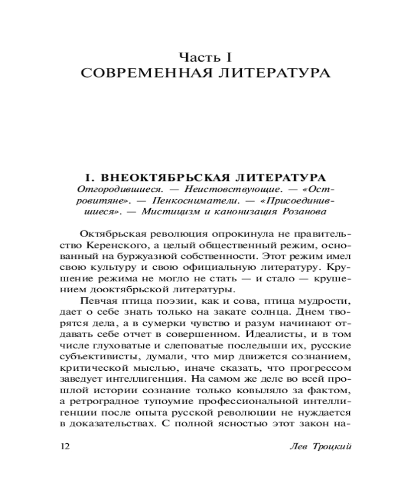 В своей напористо-экспрессивной манере автор размышляет об идеологической роли искусства — и не только литературы, но и живописи, театра и даже архитектуры, — в формировании «нового» типа личности, и весьма жестко критикует, с одной стороны «пролетарское чванство» полуграмотных идеологов и влиявших на них представителей богемного авангардизма, мечтавших «сбросить старую культуру с корабля современности», а с другой — не менее хлестко прохаживается и по традиционно-патриархальным пристрастиям в искусстве Ленина и особенно Сталина (хотя прямо ни один из них в книге и не называется). |