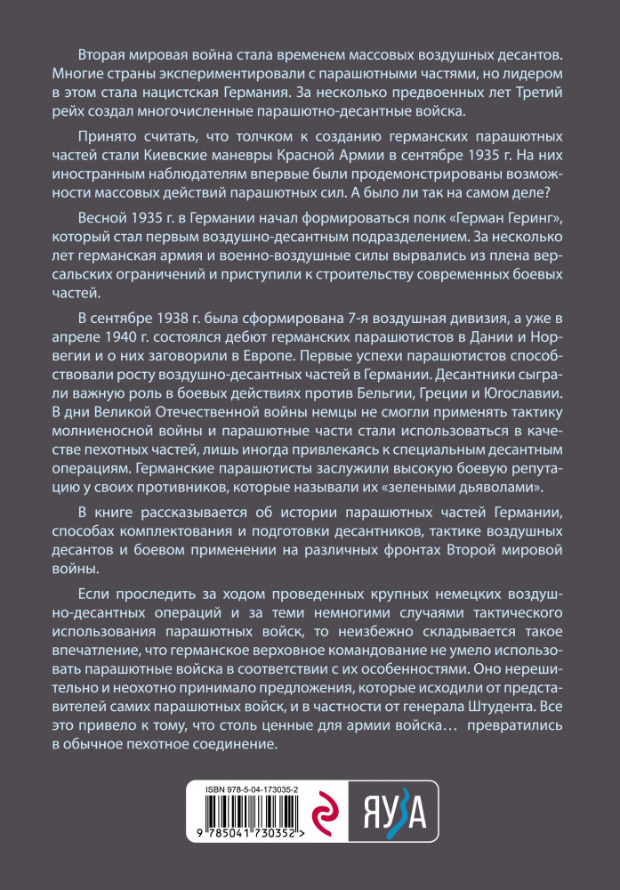 💳 Оплатить за товар можно при получении 🇰🇿 Есть бесплатная доставка по Казахстану от 1 дня 🎁 Копите бонусы с каждой покупки Серия: Лучшие воины в истории Вторая мировая война стала временем массовых воздушных десантов. Многие страны экспериментировали с парашютными частями, но лидером в этом стала нацистская Германия. За несколько предвоенных лет Третий рейх создал многочисленные парашютно-десантные войска. |
