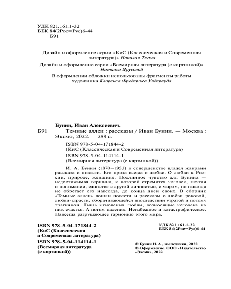 Темные аллеиВ данный момент этот товар отсутствует в продаже. Возможно, у нас найдется аналогичный или похожий товар здесь. Серия: КиС (Классическая и Современная литература) Иван Бунин — первый русский лауреат Нобелевской премии, безупречный стилист, писатель, так открыто говоривший об отношениях между мужчиной и женщиной — о любви, которая чаще длится всего мгновение, но в сердце остается на всю жизнь... |
