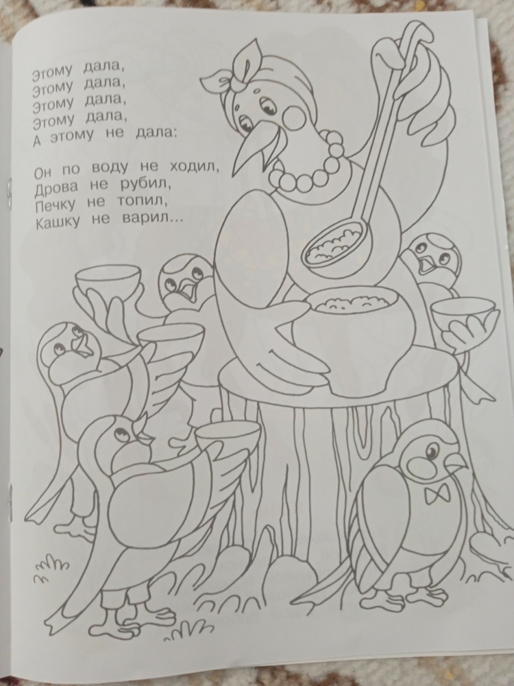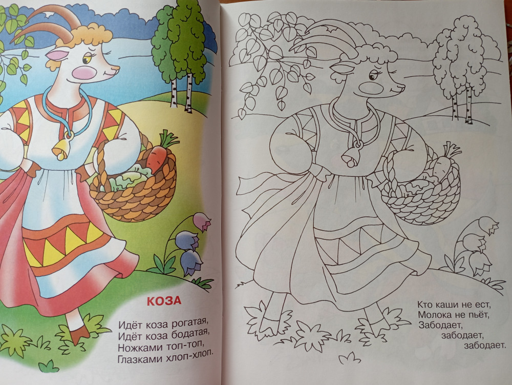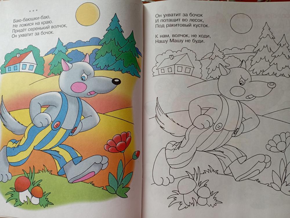 Стишки для самых маленьких, а раскраски - для детей постарше. Иллюстрации красочные, интересные. Картинки для раскрашивания - большие.