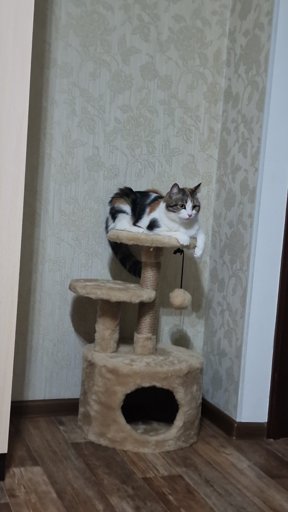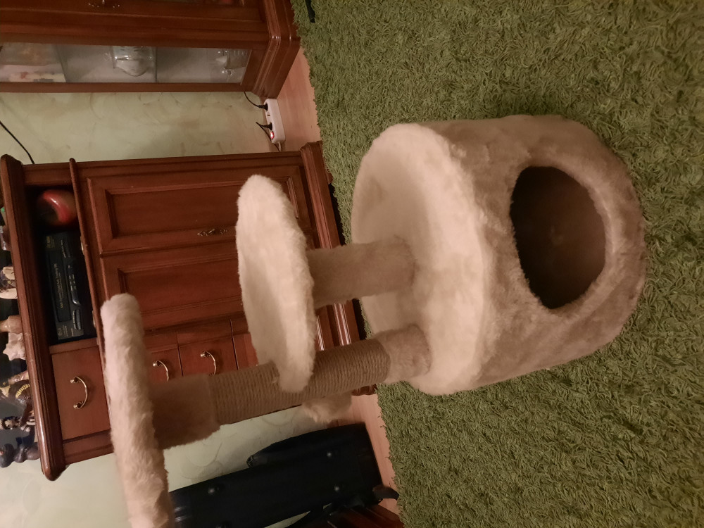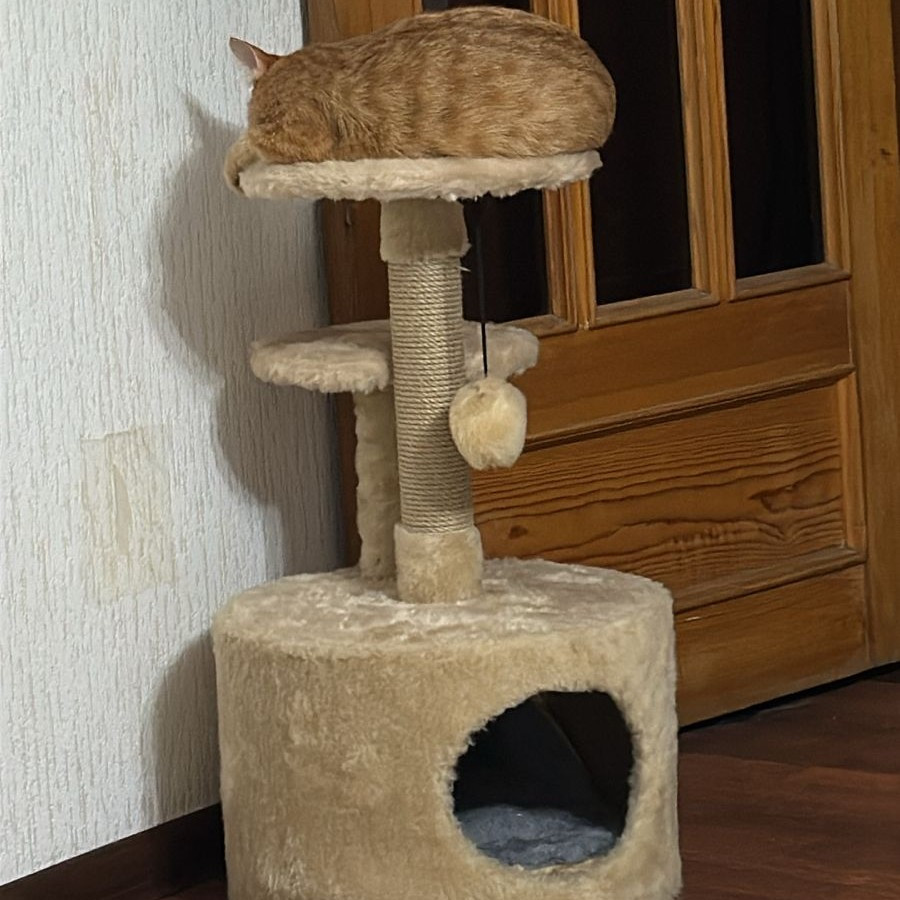 Кот в домике спит, на когтеточке ногти точит. цвет приятный и материал тоже хороший