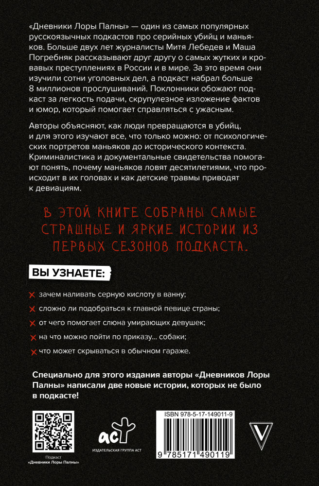 💳 Оплатить за товар можно при получении 🇰🇿 Есть бесплатная доставка по Казахстану от 1 дня 🎁 Копите бонусы с каждой покупки Серия: Криминология на пальцах «Дневники Лоры Палны» — один из самых популярных русскоязычных подкастов про серийных убийц и маньяков. Больше двух лет журналисты Митя Лебедев и Маша Погребняк рассказывают друг другу о самых жутких и кровавых преступлениях в России и в мире. За это время они изучили сотни уголовных дел, а подкаст набрал больше 8 миллионов прослушиваний. Поклонники обожают подкаст за легкость подачи, скрупулезное изложение фактов и юмор, который помогает справляться с ужасным. |