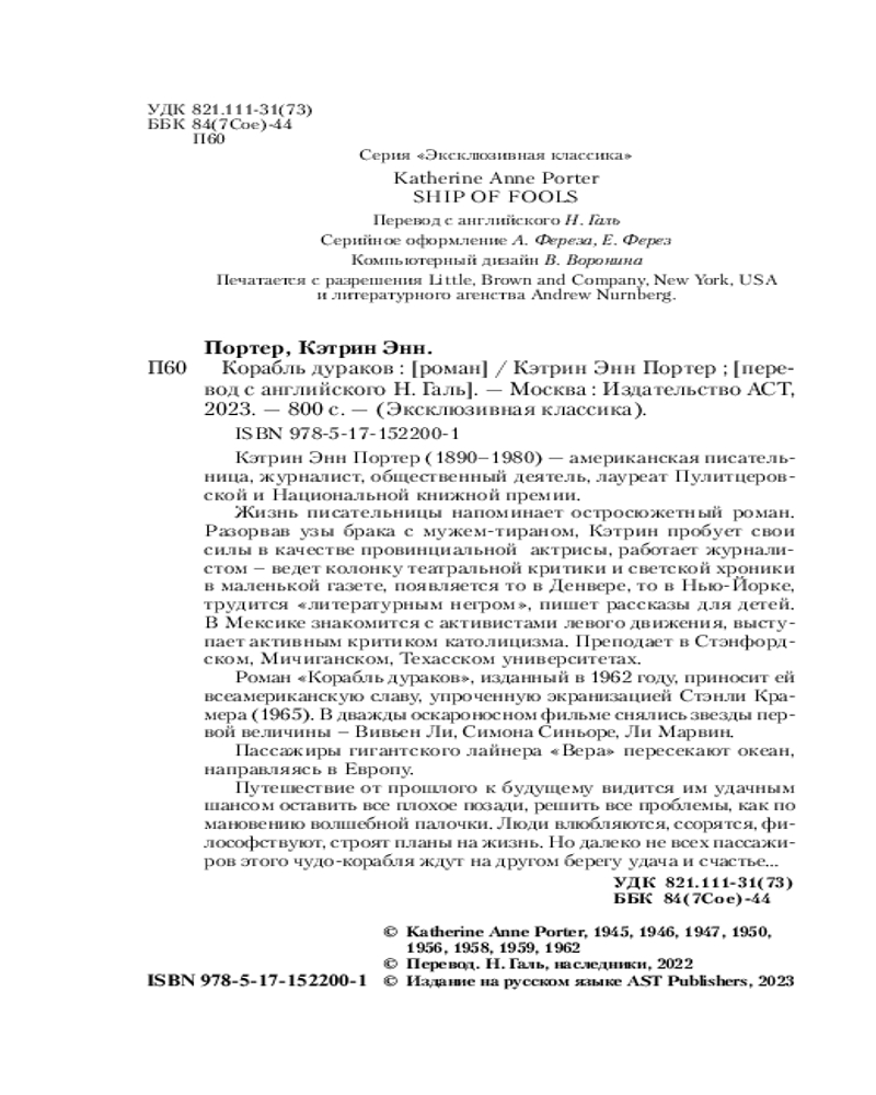 Серия: Эксклюзивная классика Кэтрин Энн Портер (1890-1980) — американская писательница, журналист, общественный деятель, лауреат Пулитцеровской и Национальной книжной премии.
