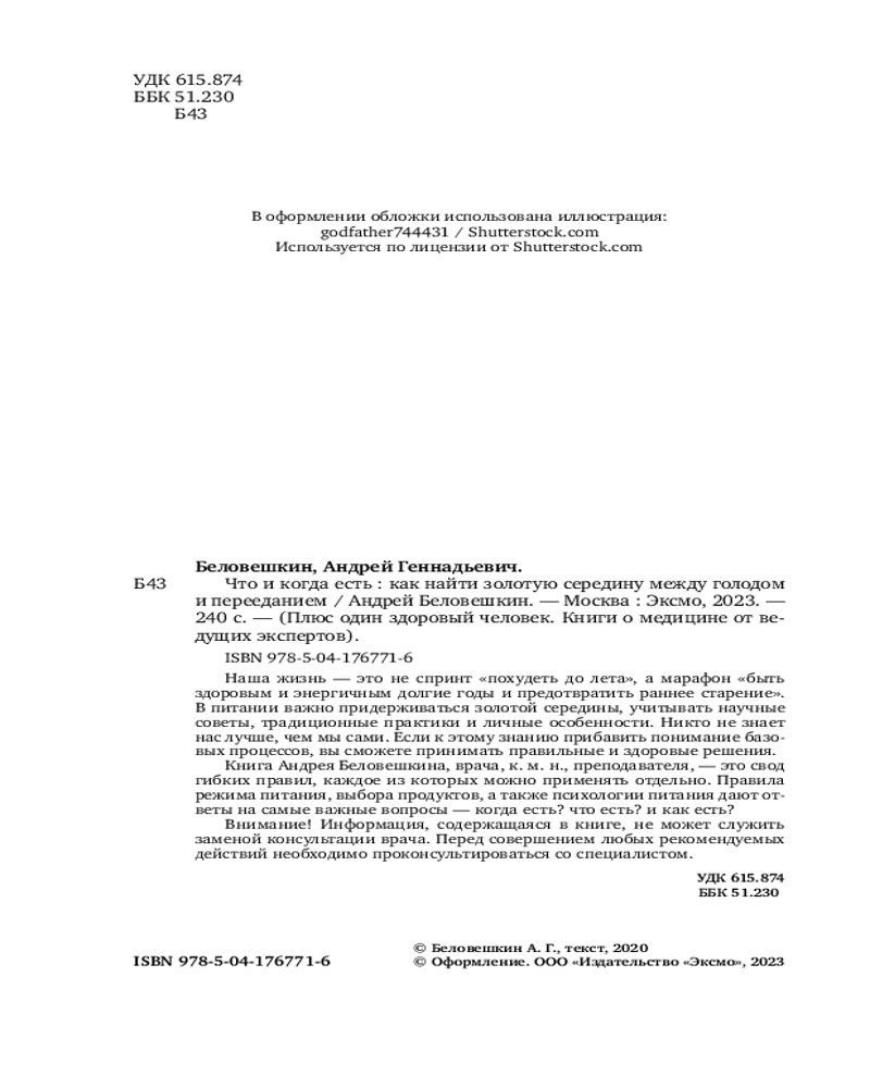 💳 Оплатить за товар можно при получении 🇰🇿 Есть бесплатная доставка по Казахстану от 1 дня 🎁 Копите бонусы с каждой покупки Серия: Плюс один здоровый человек. Книги о медицине от ведущих экспертов Питание — это не просто еда, а самый эффективный инструмент влияния на здоровье и самочувствие. Сегодня существует огромное количество методик «здорового питания»: одни увеличивают количество диетологических мифов, другие эти мифы развенчивают. Часть авторов ссылается на свой личный опыт, другие призывают его игнорировать и опираться только на доказательную медицину. |